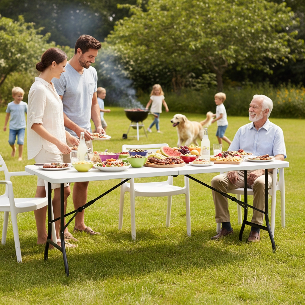 Praktična in vsestranska zložljiva miza za vrtne zabave, catering, kampiranje in tržnice. Ponuja veliko delovno površino, udobno posedi 6–8 oseb in je zahvaljujoč stabilni konstrukciji z blokado nog ter protizdrsnim zaključkom varna. Plošča iz odpornega HDPE je vodoodporna in preprosta za čiščenje, miza se hitro zloži in enostavno prenaša.