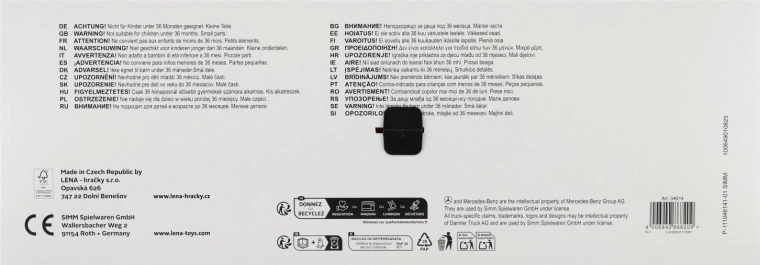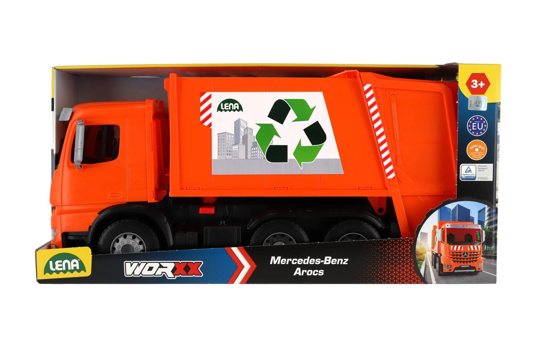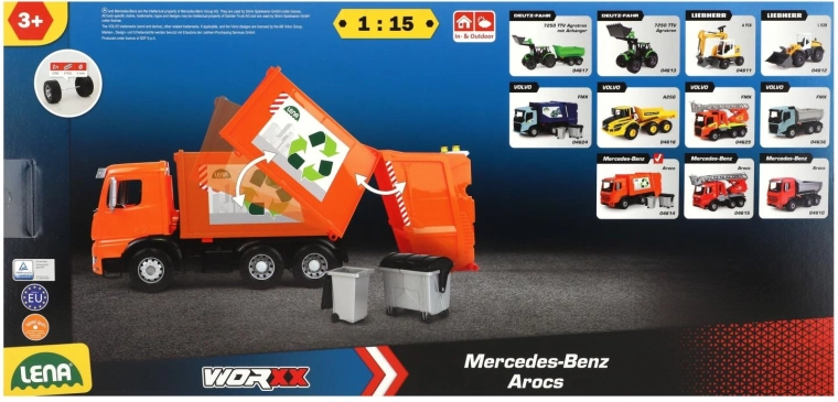 Smetarsko vozilo MERCEDES AROCS znamke LENA je natančno izdelano vozilo za male ljubitelje tehnike. Zaradi robustne izdelave iz kakovostne, odporne plastike in močnih kovinskih osi koles zlahka prenese vsakodnevno igro v notranjosti in na prostem. Funkcionalni zadnji del z varovalnim zatičem omogoča varno nakladanje in prevrnitev odpadkov.
