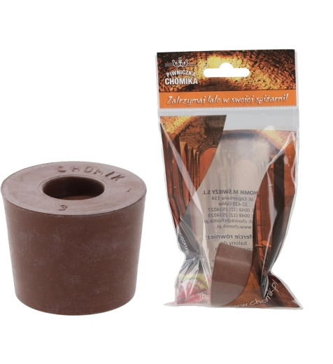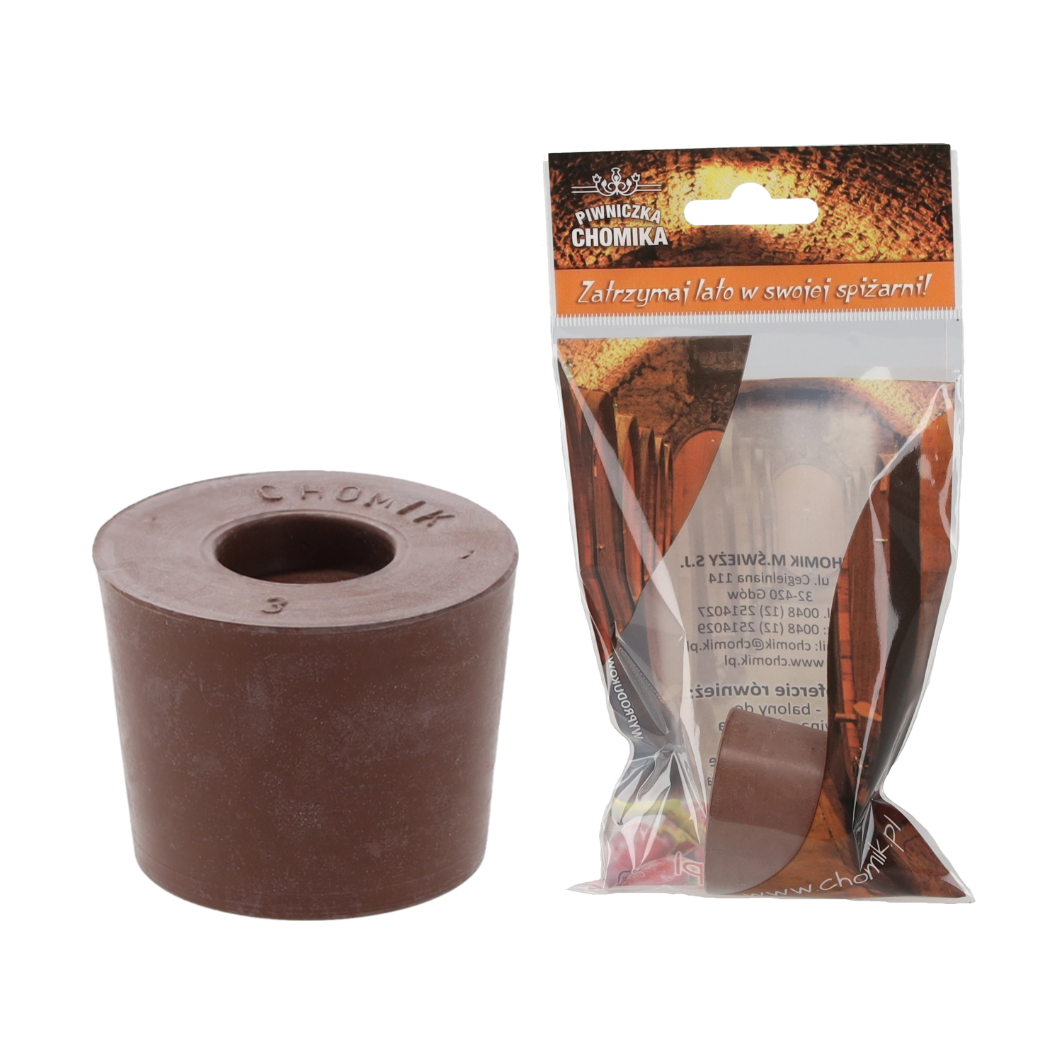 Gumijasti zamašek št. 3 je zanesljiva rešitev za domače vinarje in vse, ki pripravljajo fermentirane pijače. Zaradi natančnih mer in prožne zasnove odlično tesni ter ščiti vsebino posode pred nečistočami in zrakom. Odprtina s premerom 10 mm je pripravljena za standardno vrelno veo, ki omogoča nadzorovan izpust CO₂ med fermentacijo.
