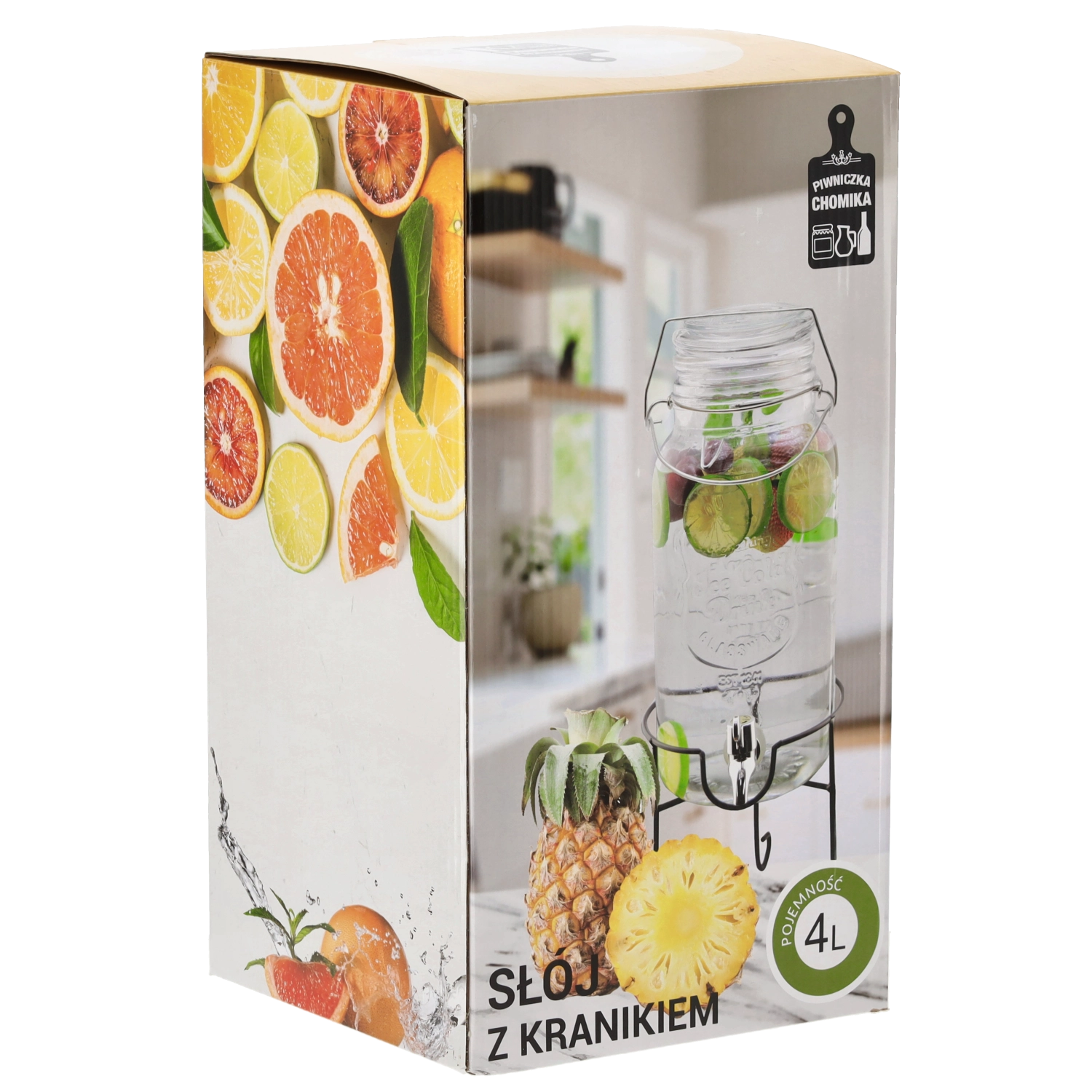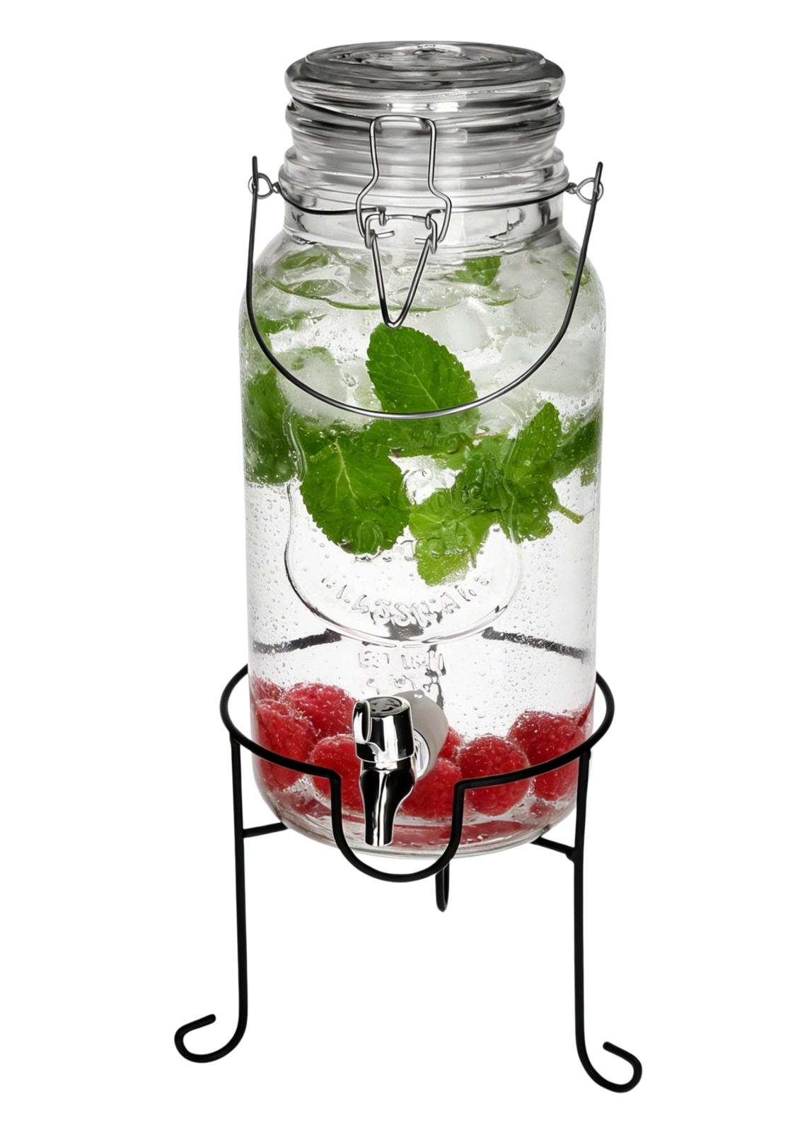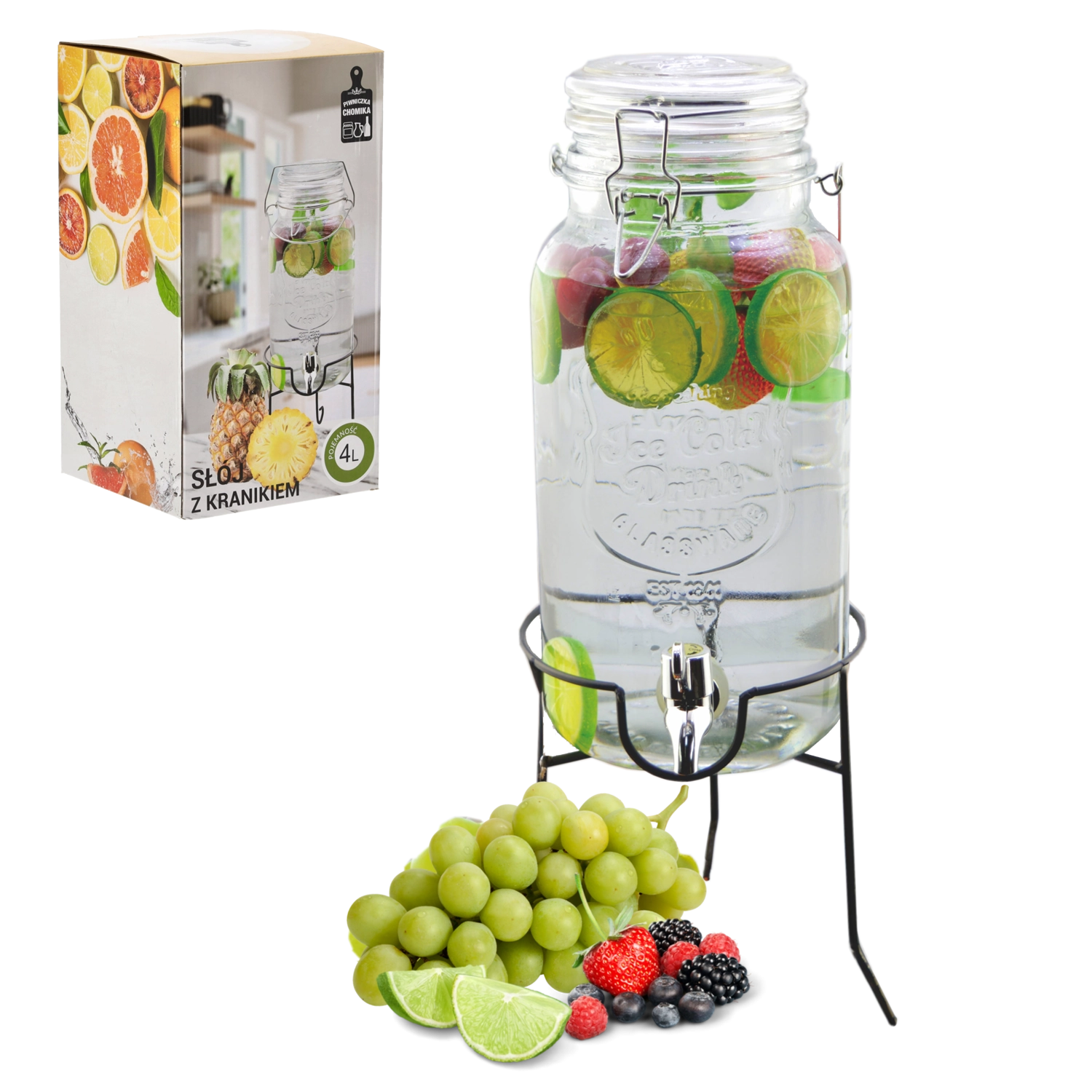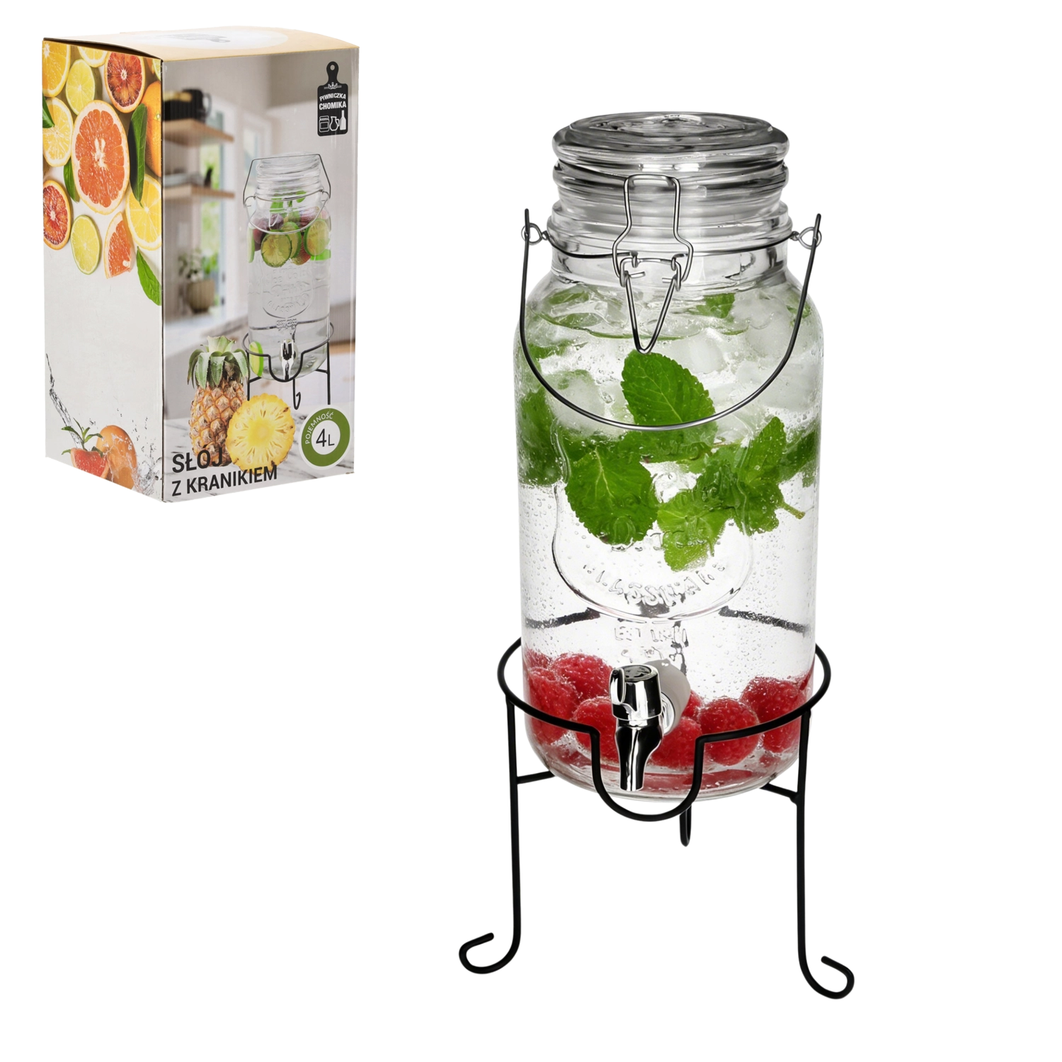 Eleganten stekleni dozirnik za pijače s prostornino 4 litre na stabilnem kovinskem stojalu je idealen za serviranje limonad, sokov ali punčev na zabavah in vsak dan. Ponuja praktično pipico za natančno odmerjanje brez polivanja, širok vrat za enostavno polnjenje in čiščenje ter odporno, debelo steklo z embosiranim dizajnom, ki pritegne že na prvi pogled.