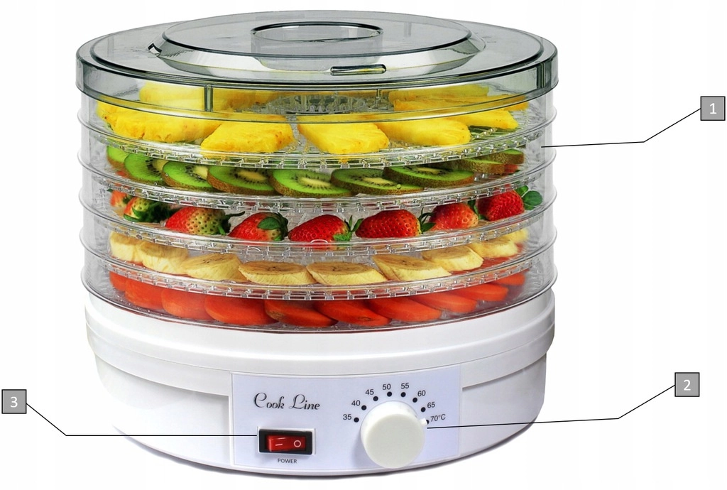 Sušite več sestavin hkrati na 5 prozornih nadstropjih – idealno za sadje, zelenjavo, gobe in zelišča.