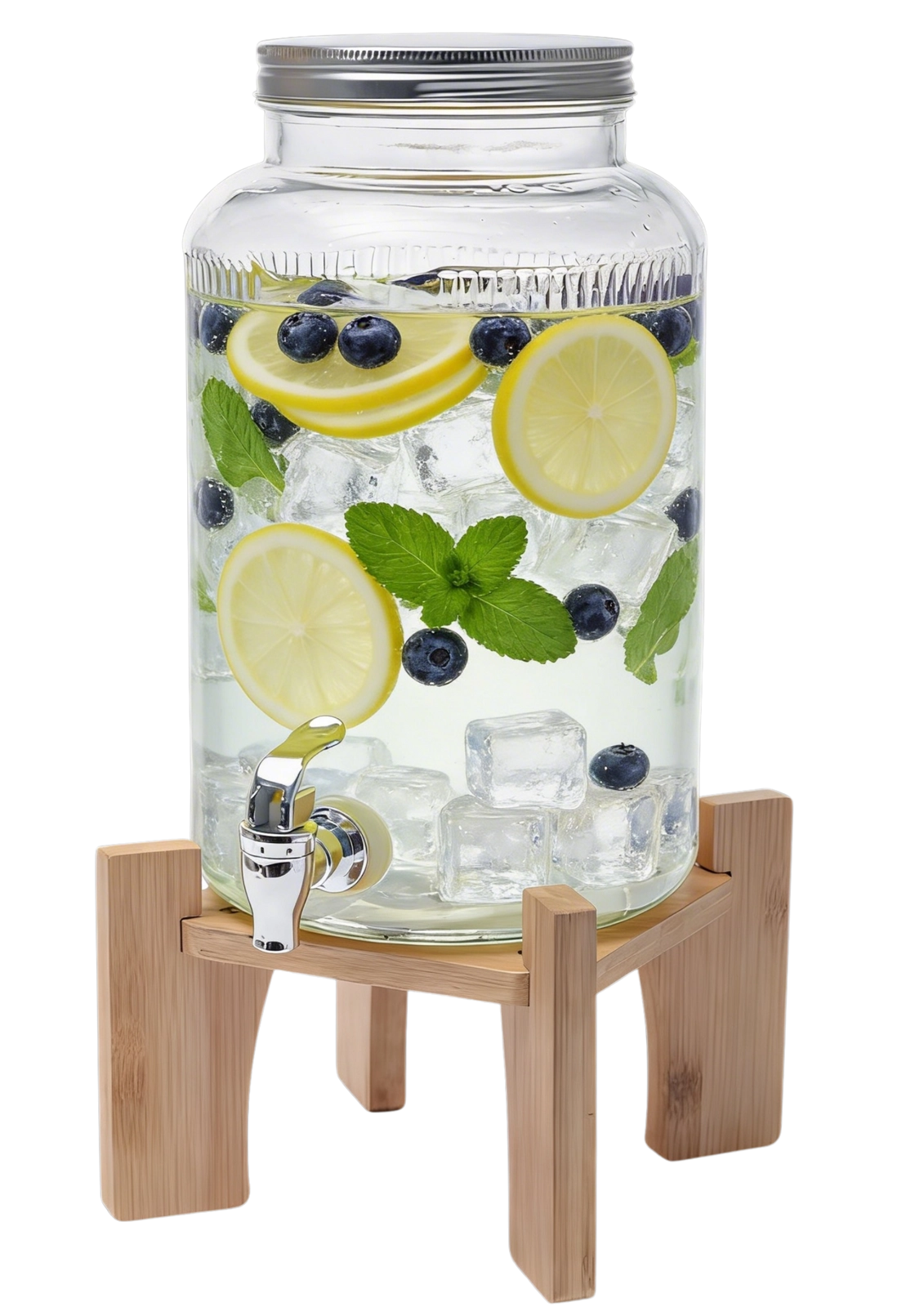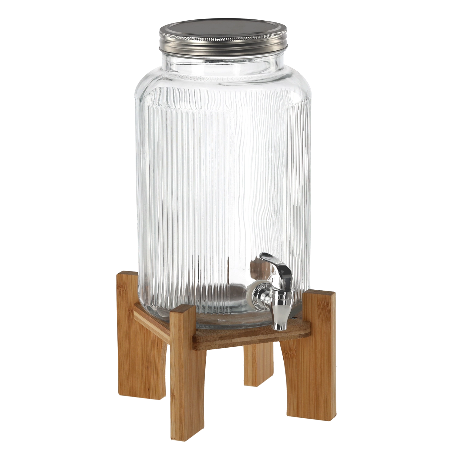 Ta eleganten stekleni dozirnik z dekorativnim rebrastim vzorcem ponuja privlačno predstavitev pijač in hkrati pregled nad njihovo količino. Stabilno leseno stojalo dvigne posodo na udobno višino za polnjenje kozarcev, zato je postrežba hitra in brez nereda. Odlično se poda k poletnim limonadam, sadnim vodam, ledenim čajem in zabavnim koktajlom.