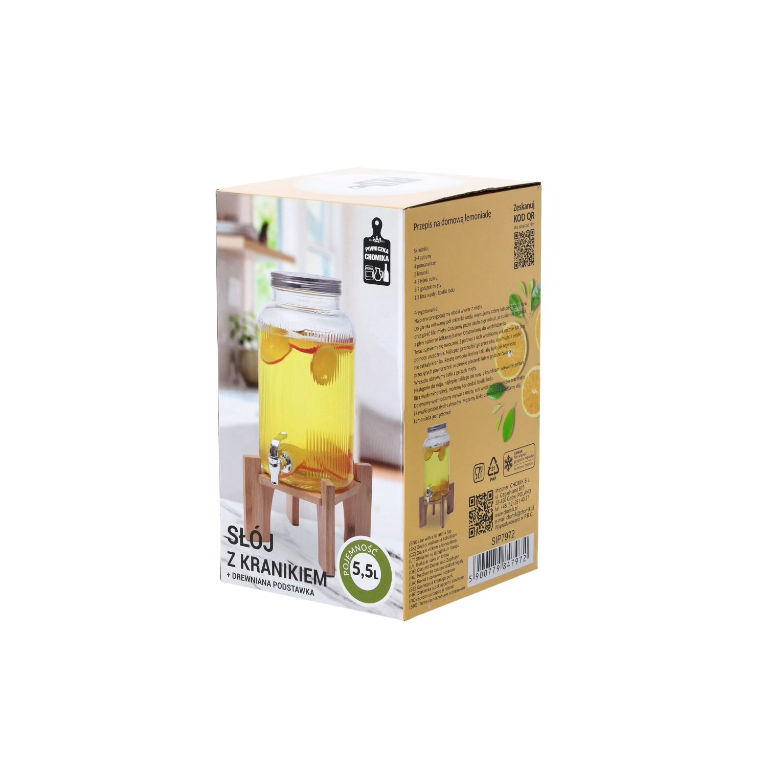 Stilski stekleni dozirnik za pijače s prostornino 5,5 l in lesenim stojalom je idealen za serviranje limonad, koktajlov in domačih pijač na vrtnih zabavah, piknikih in družinskih praznovanjih. Zahvaljujoč široki odprtini zlahka dodate sadje, led in zelišča ter po dogodku vse preprosto očistite. Plastična pipica v srebrni barvi omogoča natančno natočenje brez polivanja, kovinski pokrov pa ščiti pijačo pred nečistočami in insekti.