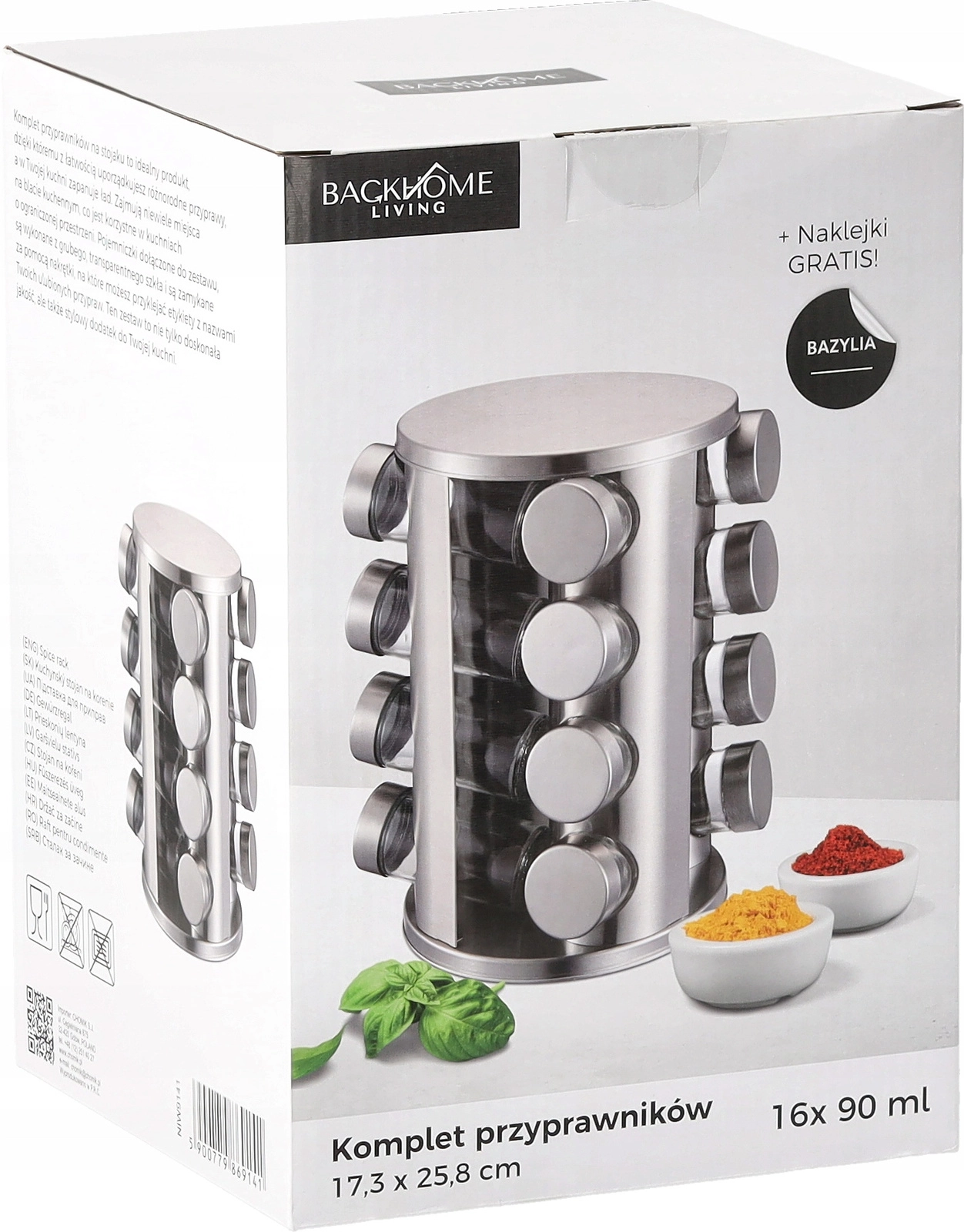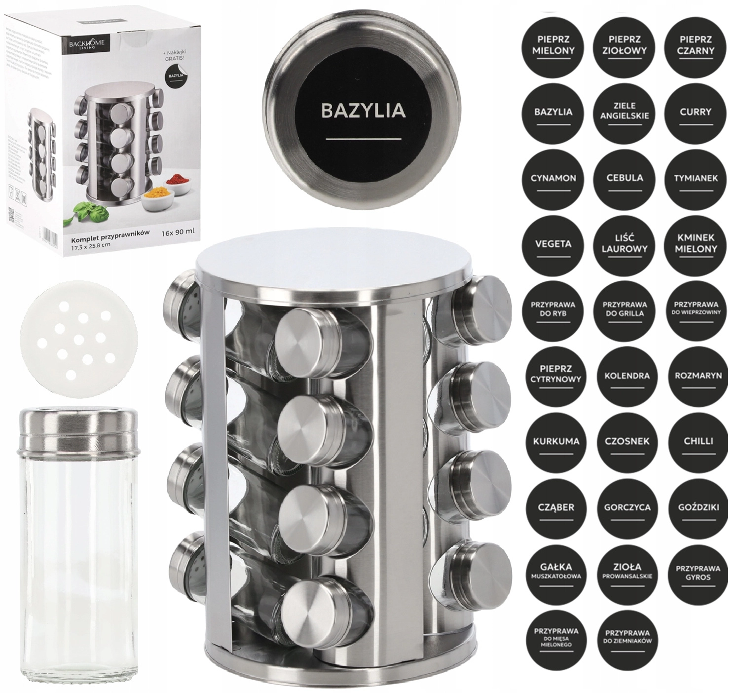 Praktično vrtljivo stojalo za začimbe s premerom 17,3 cm in višino 25,8 cm iz odpornega nerjavečega jekla s 16 steklenimi kozarčki. Ponuja pregledno shranjevanje začimb, lahek dostop zahvaljujoč vrtljivi zasnovi in eleganten videz za vsako kuhinjo. Priložena je komplet 38 nalepk za hitro označevanje kozarčkov.