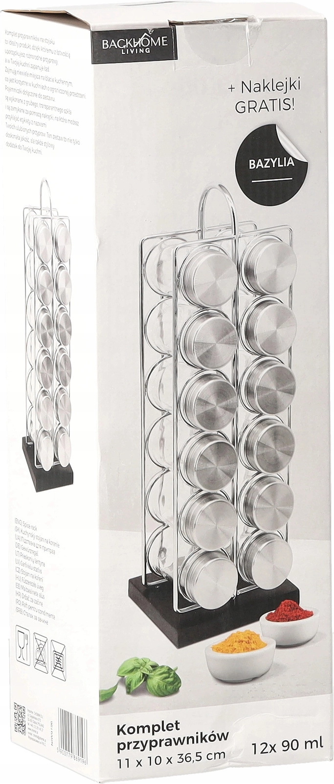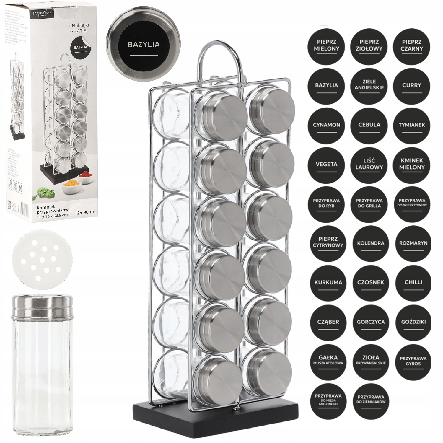 Priložen je tudi komplet 38 nalepk z najpogostejšimi imeni začimb (npr. sol, poper, origano, bazilika, kari, kurkuma, sladka/ostra paprika, cimet, česen, timijan itd.), s katerimi komplet preprosto prilagodite in ohranite popoln pregled.