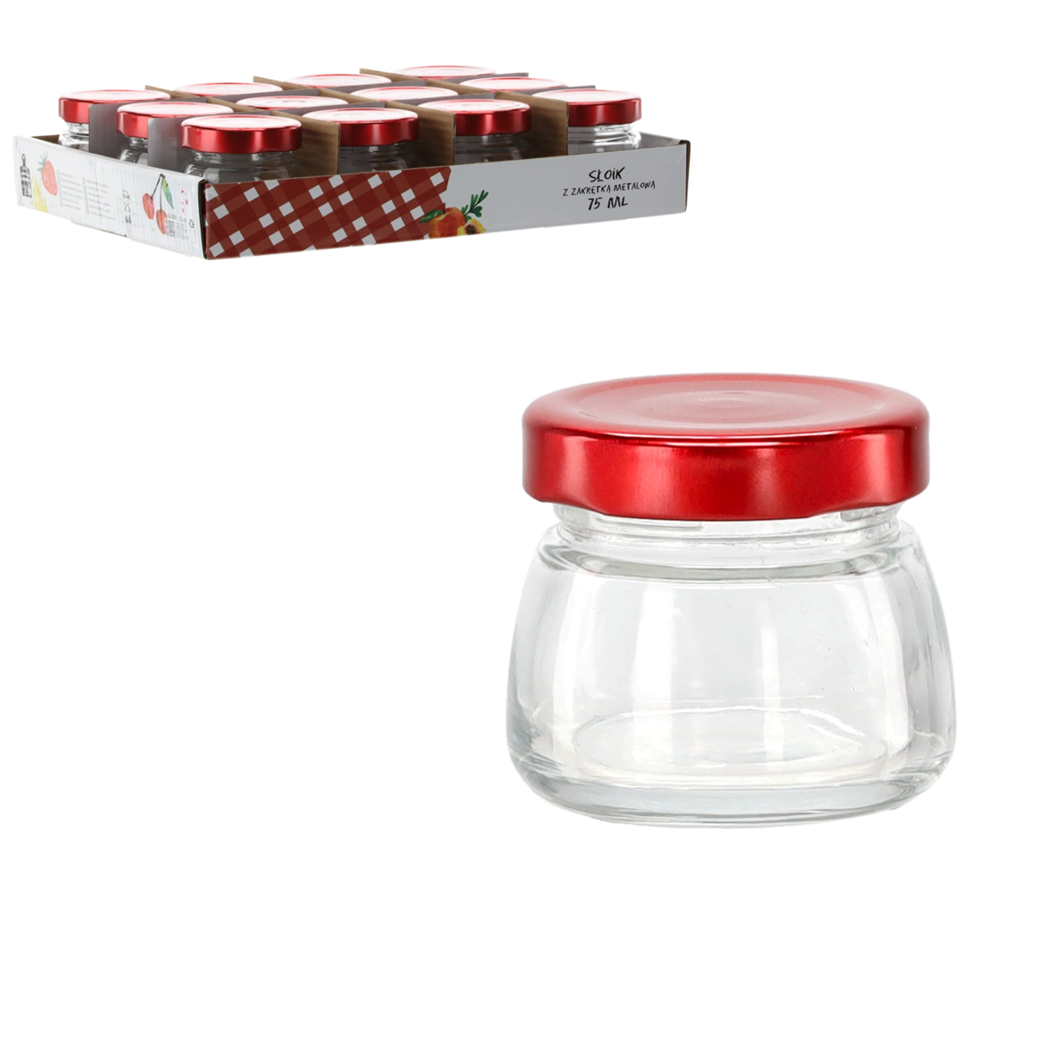 Ta elegantna doza s prostornino 75 ml je izdelana iz kakovostnega prozornega stekla, ki poudari barvo in teksturo shranjenih živil. Rdeč kovinski pokrovček zagotavlja zanesljivo zapiranje in pomaga ohraniti svežino, aromo in okus vaših domačih dobrot.