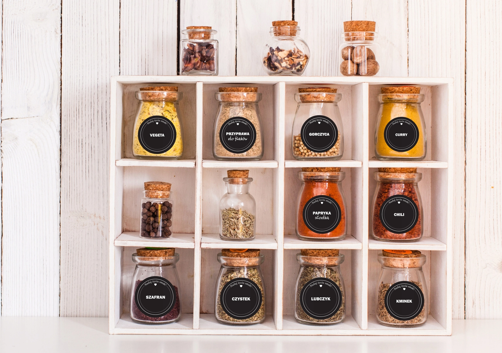 Minimalističen videz in berljiva tipografija zagotavljata hitro orientacijo med začimbami, zelišči in prehranskimi dopolnili. Del kompleta je 9 praznih etiket za lastne mešanice ali manj običajna poimenovanja, tako da bo res vse označeno.