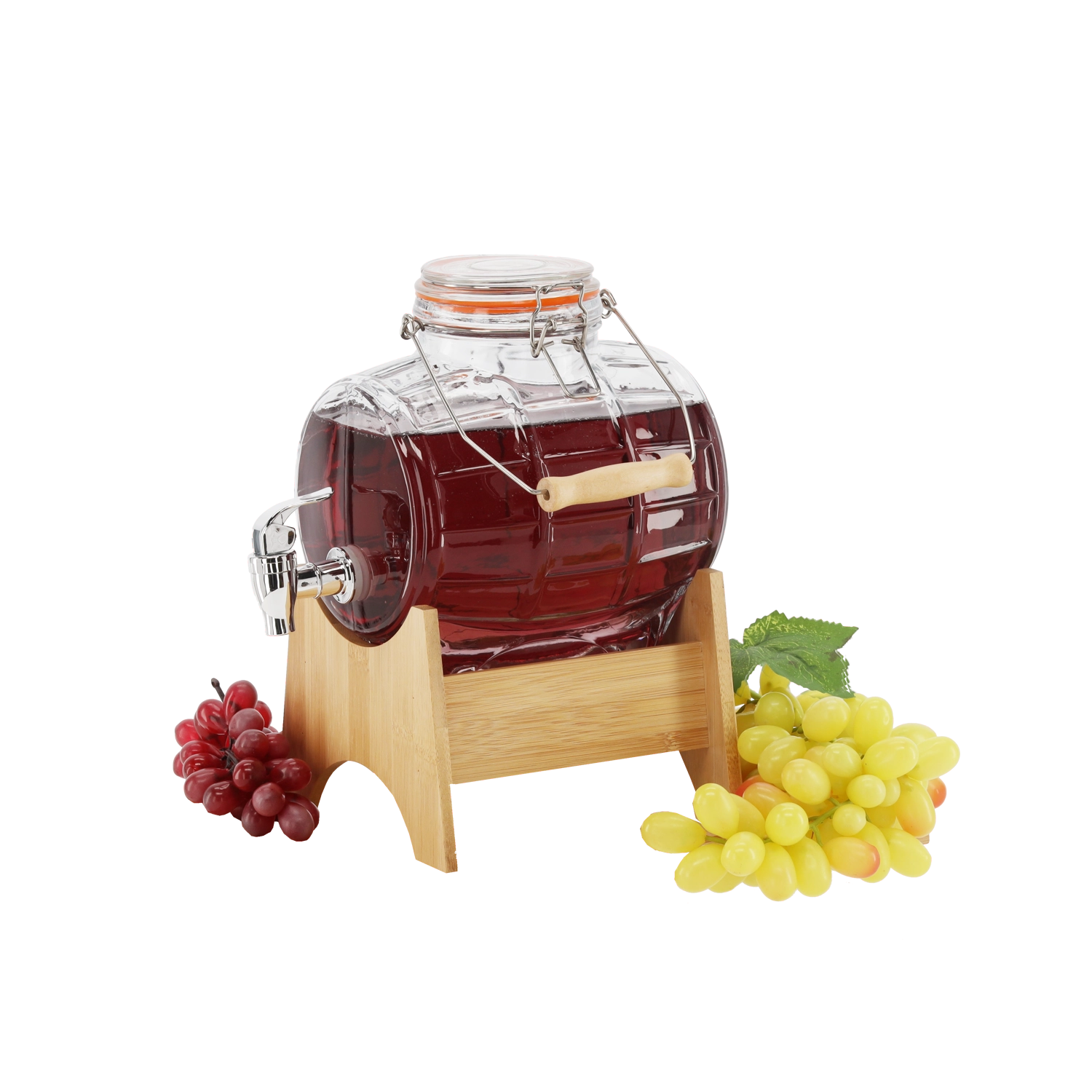 Stilski steklen sodček s prostornino 3 litre je idealen za serviranje vina, piva, sokov in limonad. Ponaša se z odpornim, debelim steklom, praktično plastično pipico za gladko natočenje ter mehanskim zapiralom z gumijastim tesnilom za popolno tesnjenje. Priloženo je tudi elegantno bambusovo stojalo, ki zagotavlja stabilnost in udobno uporabo doma, na zabavah in porokah.