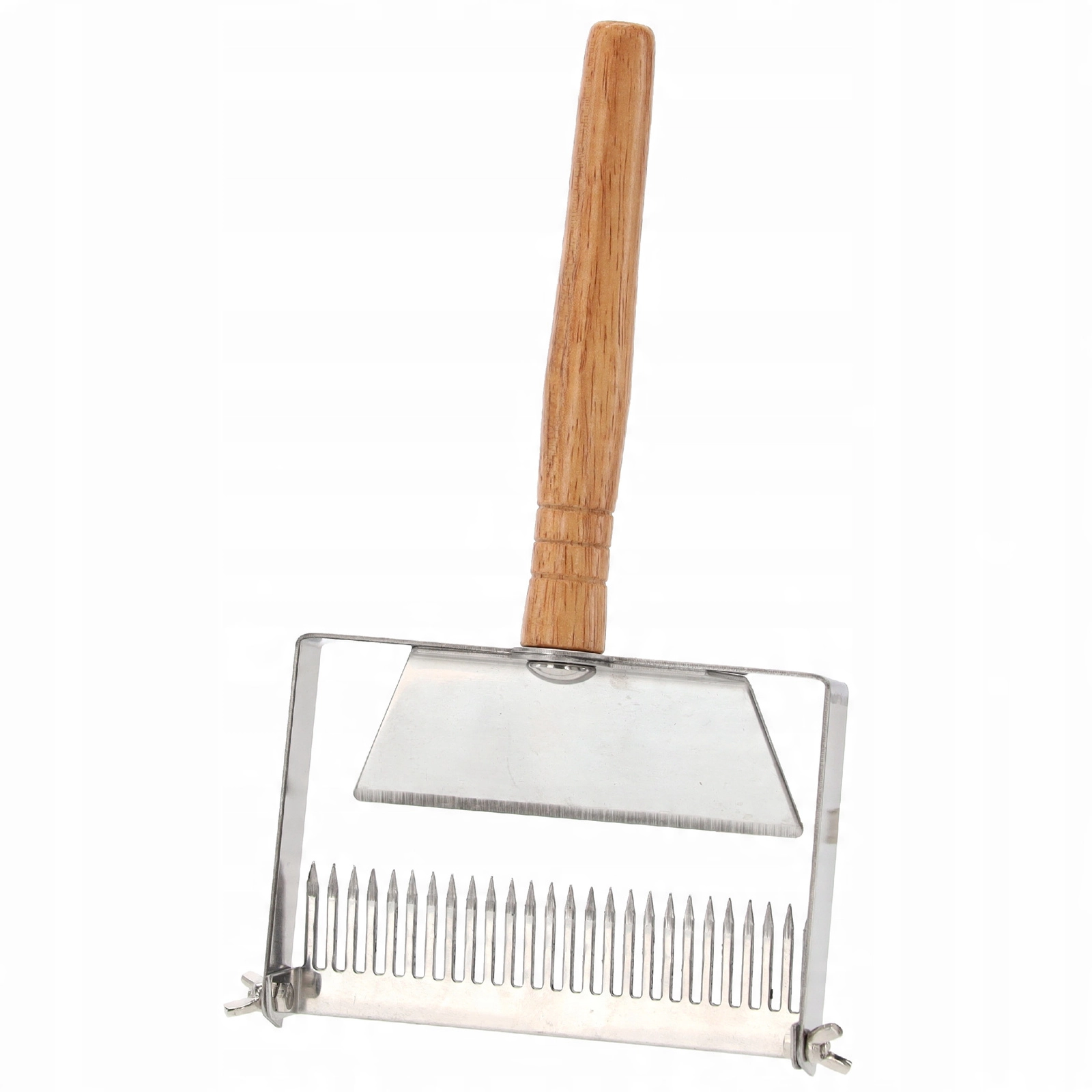 Ta profesionalna odkrivna vilica je izdelana iz trpežnega nerjavečega jekla, ki se enostavno čisti in ne vpliva na okus ali kakovost medu. Ergonomski leseni ročaj zagotavlja zanesljiv oprijem in udobno delo tudi pri daljši uporabi.