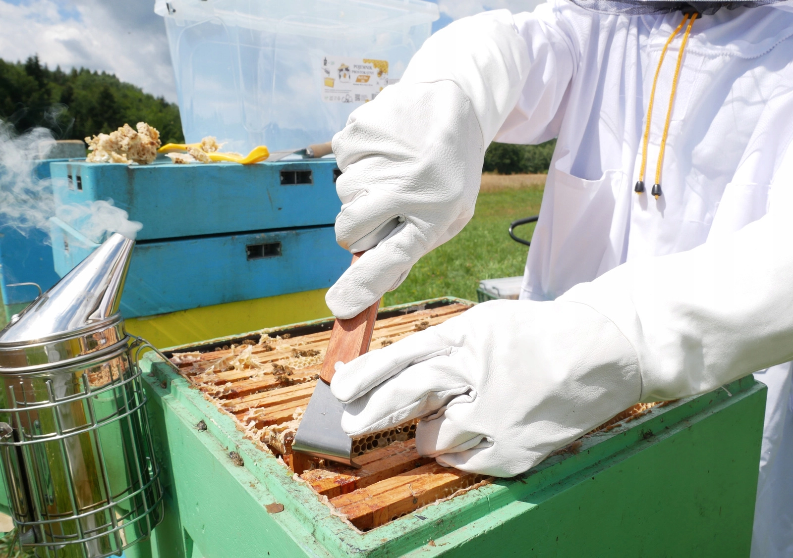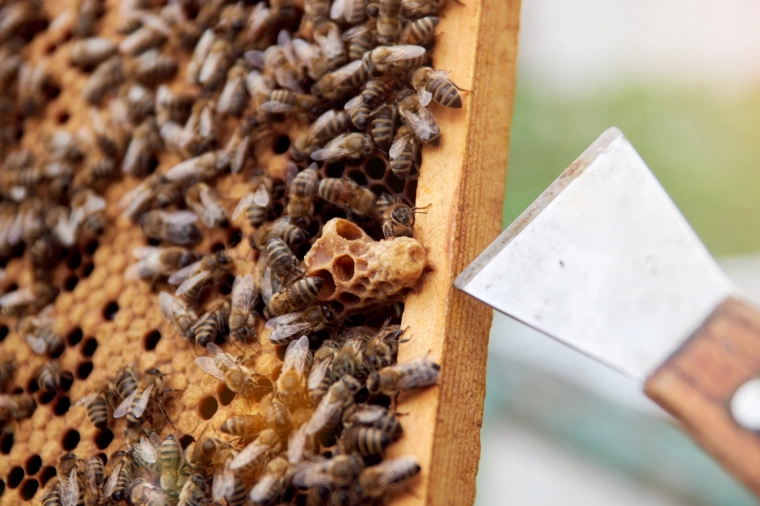 Posebej oblikovana kljukica in razpršilec omogočata varno ločevanje zlepljenih delov ter gladko izvleko satnikov brez poškodbe satja.