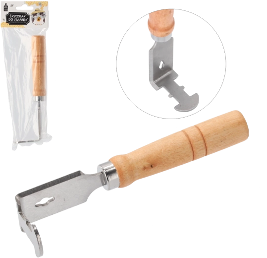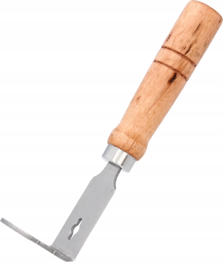 Praktično čebelarsko strgalo za okvirje z udobnim lesenim ročajem za enostavno čiščenje okvirjev, sten in utorov panja. Zahvaljujoč posebnemu profilu doseže tudi v zareze za žičke in zlahka očisti okvirje propolisa in voska. Oster rob olajša strganje, vgrajena odprtina za izvlek žebljičkov ali za obešanje orodja povečuje praktičnost pri delu v čebelnjaku.