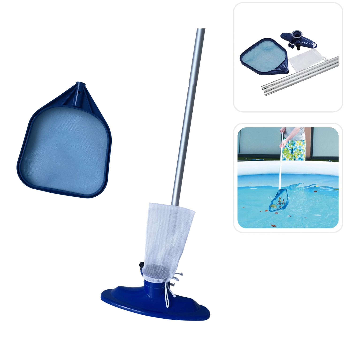 Ta celovit komplet za vzdrževanje bazena je zasnovan za hitro in udobno čiščenje manjših nadzemnih bazenov. Lahka palica olajša upravljanje, medtem ko sesalna glava s priklopom na cev 3/4'' vsesava nečistoče v večkrat uporabno vrečko. Mrežica za listje poskrbi za plavajoče nečistoče na površini.