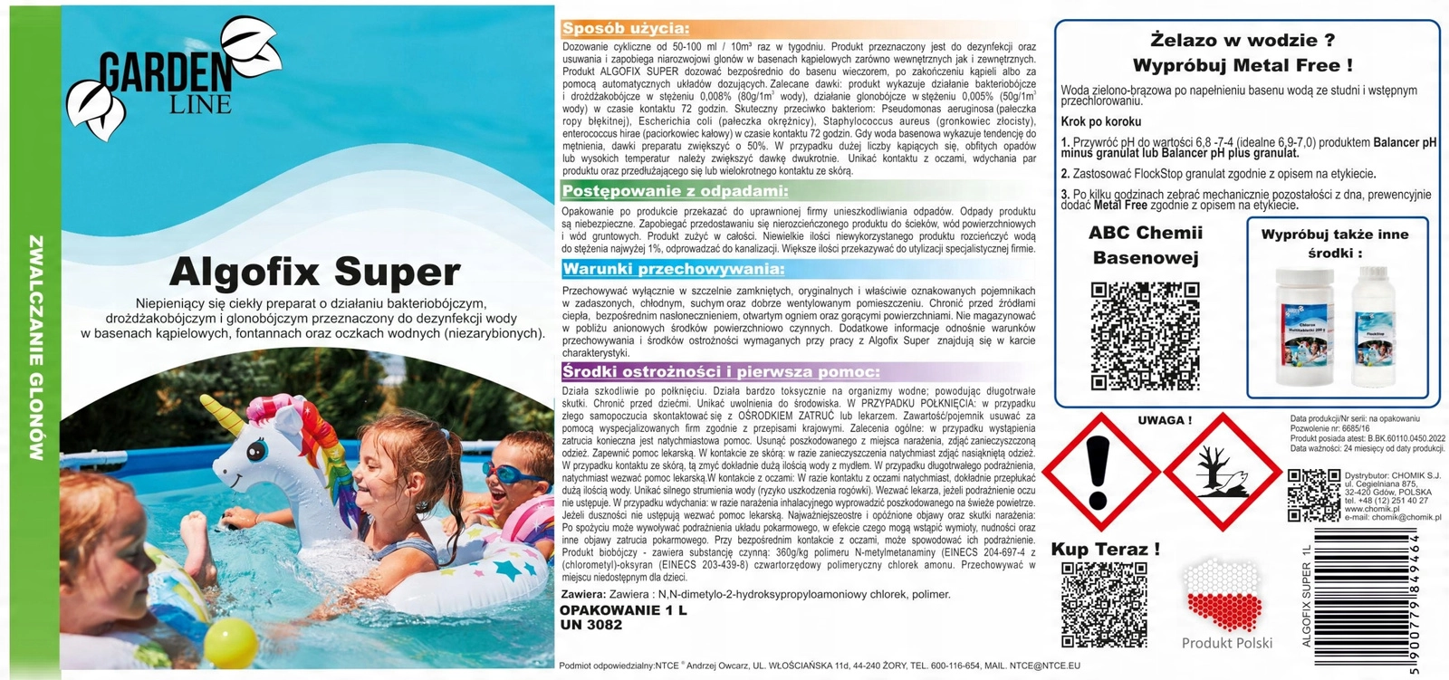 Algofix Super je sodoben, nepenilni tekoči pripravek za celovito dezinfekcijo bazenske vode. Učinkovito uničuje alge, bakterije in kvasovke, ohranja vodo kristalno čisto in varno v zunanjih in notranjih bazenih, fontanah ter neporibljenih vrtnih ribnikih. Idealen tudi pri visokih temperaturah in intenzivni uporabi brez nastajanja pene.