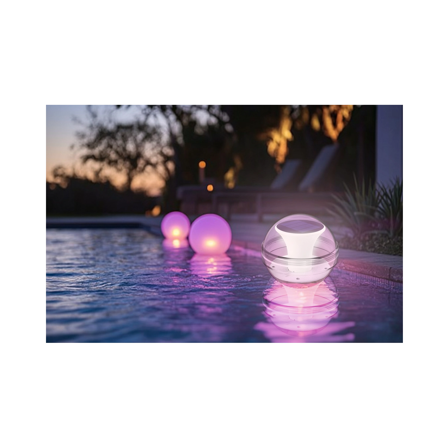 Prozorna krogla je popolnoma zatesnjena in varno plava na vodni gladini. Zaščita IP65 varuje pred dežjem in škropljenjem – idealno za bazen in vrt.