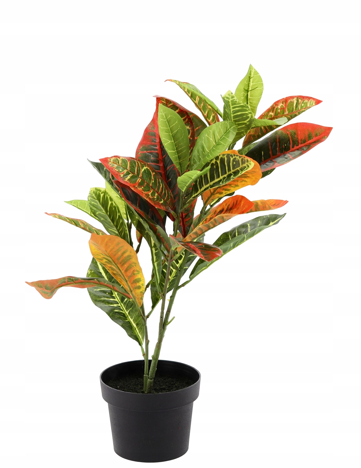 Umetna sobna rastlina, navdihnjena s krotonom, je odlična izbira za vsakogar, ki želi takoj poživiti notranjost brez skrbi z nego. Kombinacija pisanih listov in kompaktnega črnega lončka ustvari dekoracijo, ki izstopa doma in v poslovnih prostorih.