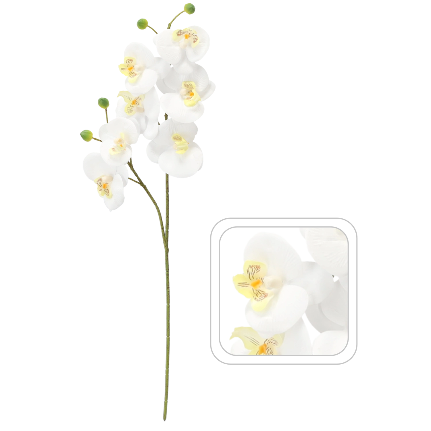 V prostor vnesite brezčasno lepoto z umetno vejo orhideje v beli barvi. Realistični cvetovi in dovršena izvedba ustvarjajo vtis sveže razcvetle rastline, ki pa ne zahteva nobenega vzdrževanja. Popolna izbira za moderne in klasične interierje, poroke, recepcije ter sezonske dekoracije.