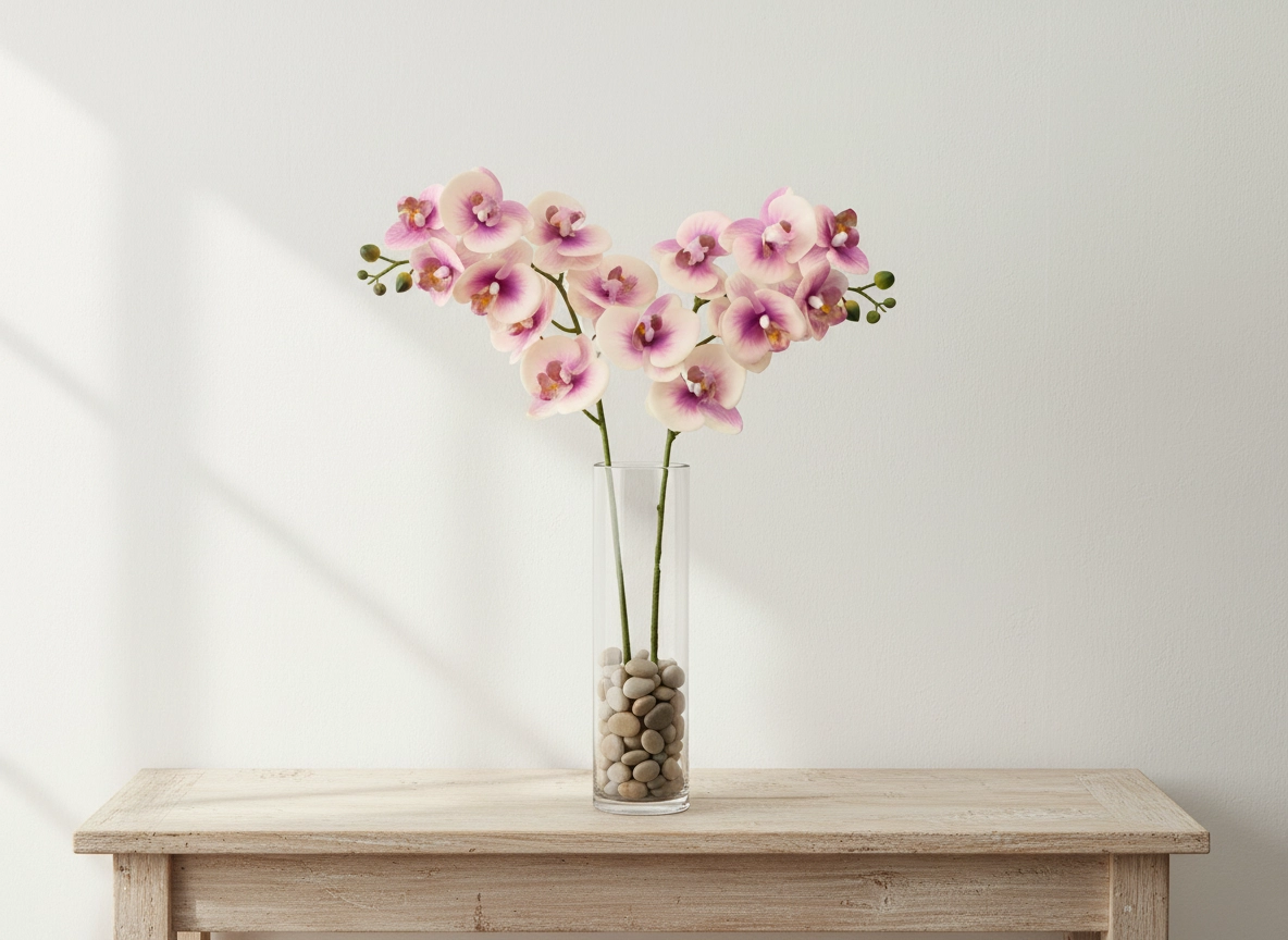 Elegantna umetna veja orhideje višine 82 cm očara s svojim realističnim videzom in nežnim spojem rožnato‑belih cvetov z vijoličnim pridihom. Odlična dekoracija za dnevno sobo, spalnico, pisarno in recepcijo brez potrebe po vzdrževanju.