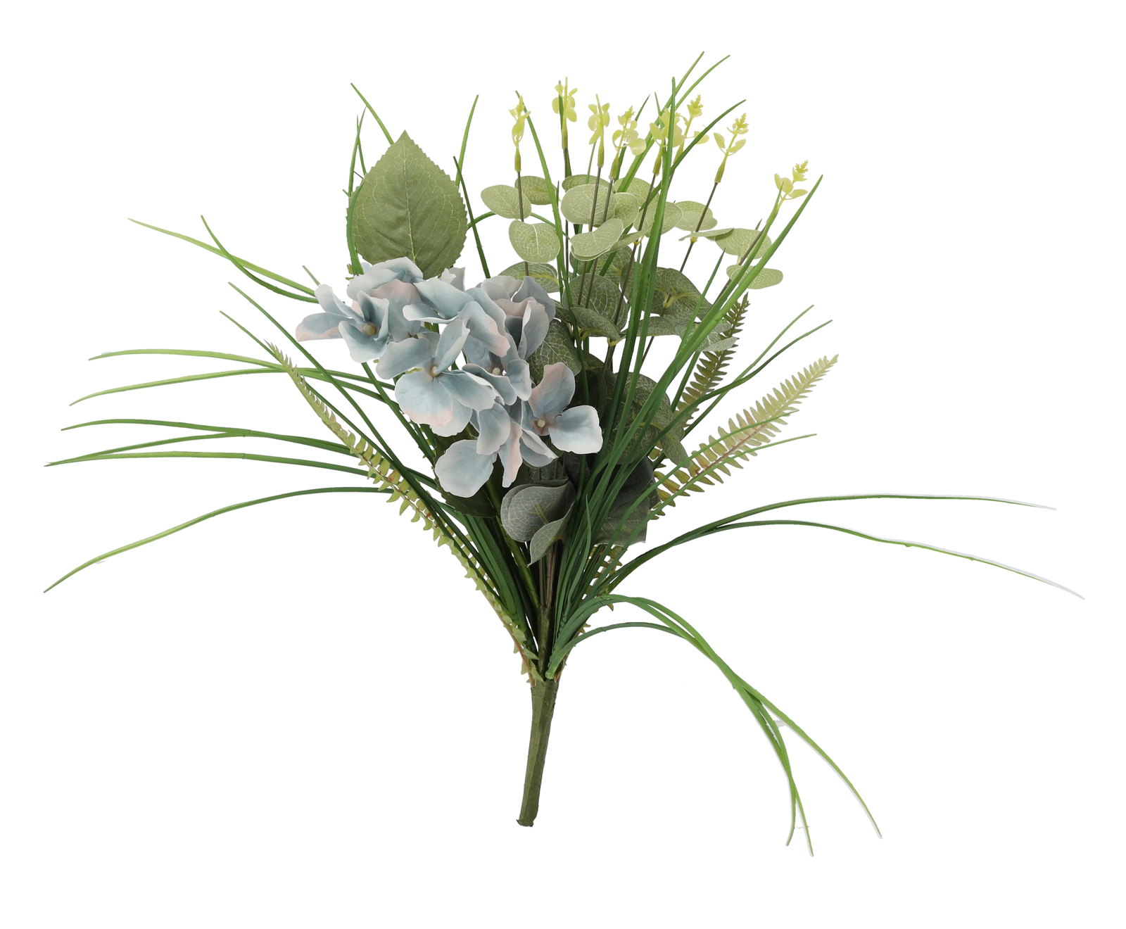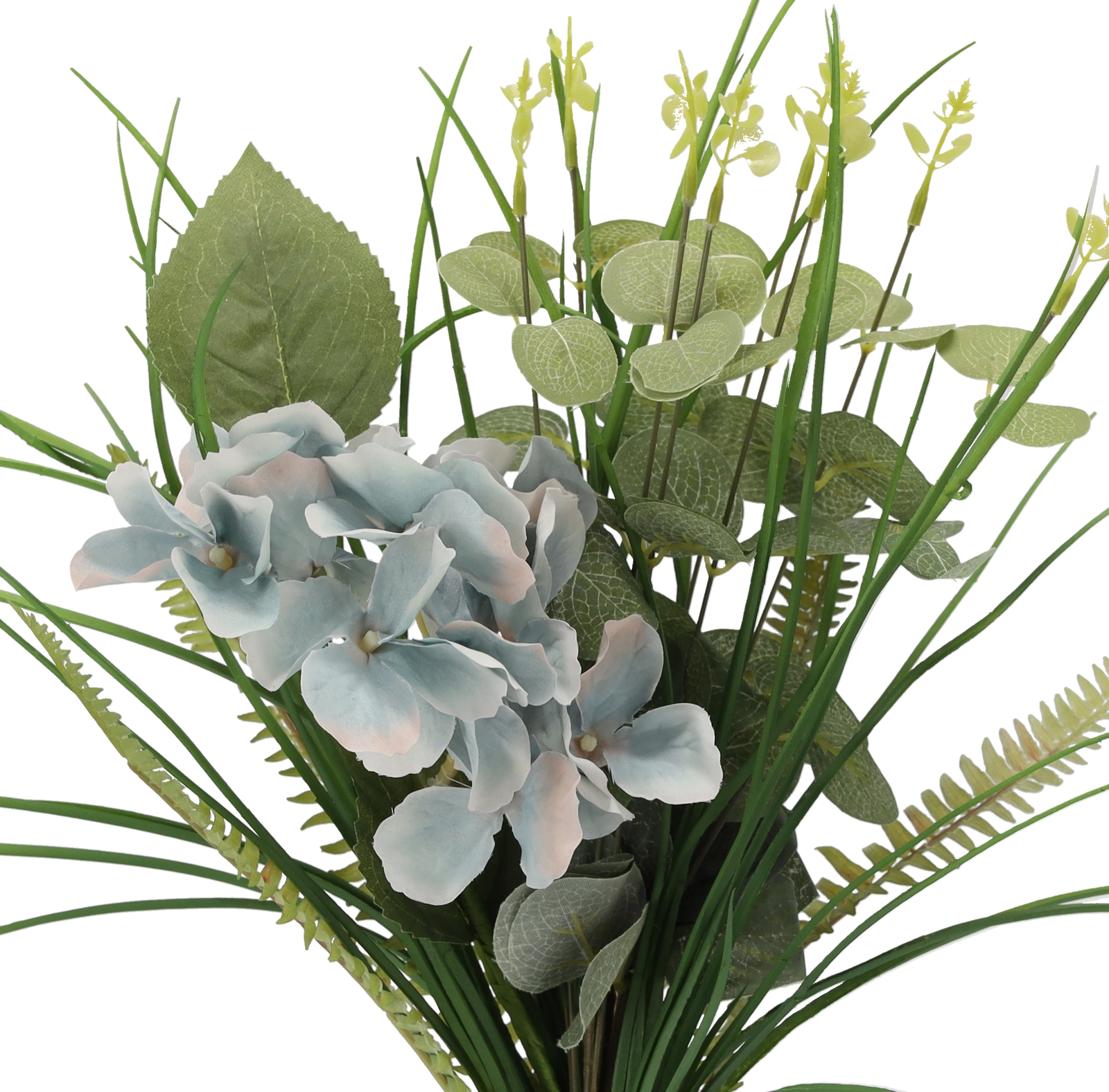 Stilska dekoracija, pripravljena za razstavljanje, ki doda notranjosti svežino in eleganco. Umetni šopek višine 45 cm združuje nežne modre cvetove z raznolikim zelenim listjem in travami za naraven videz brez potrebe po vzdrževanju.