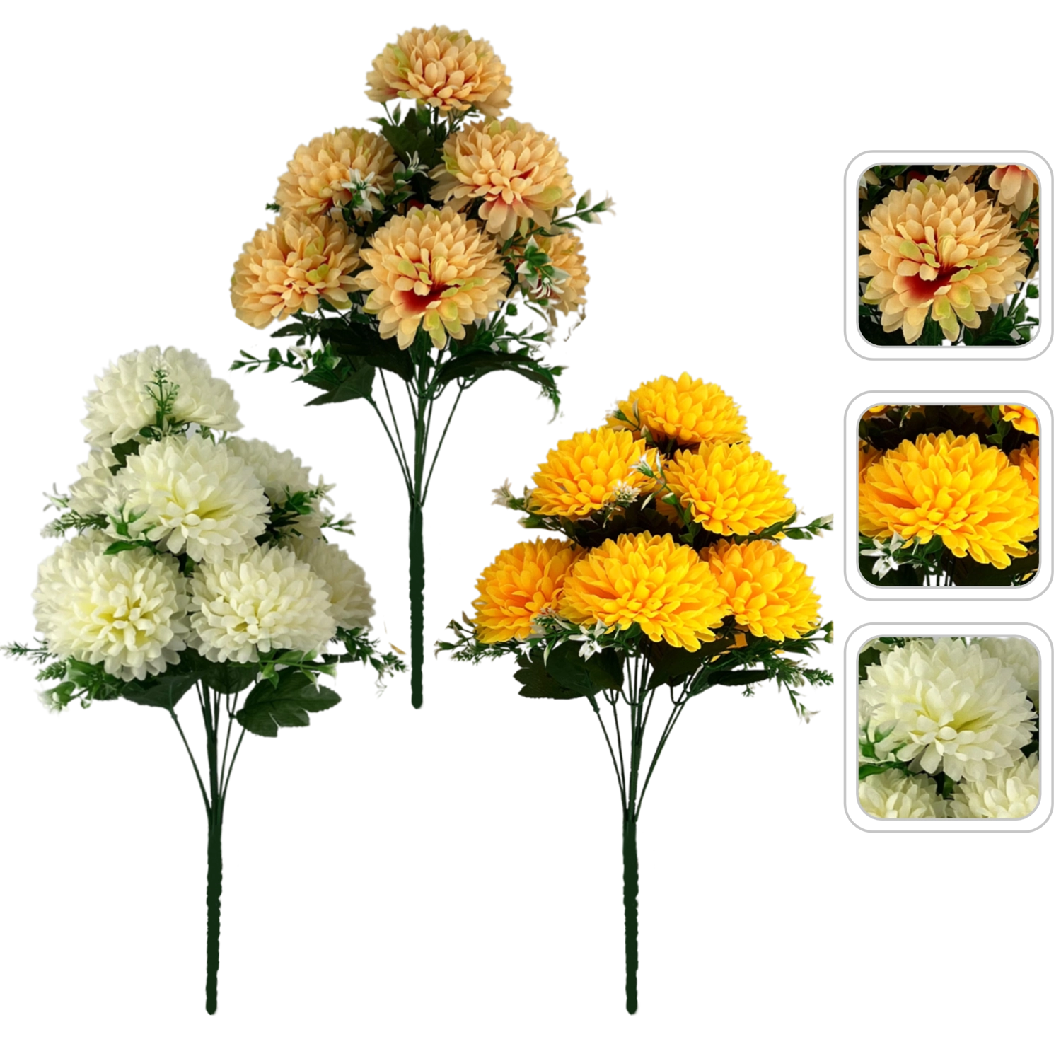 Ta umetni šopek krizantem je idealna izbira za trajno okrasitev doma, pisarne in komercialnih prostorov. Zaradi realistične izdelave cvetov, listov in trav deluje zelo pristno, brez potrebe po zalivanju ali posebni negi pa ohrani svež videz skozi vse leto.
