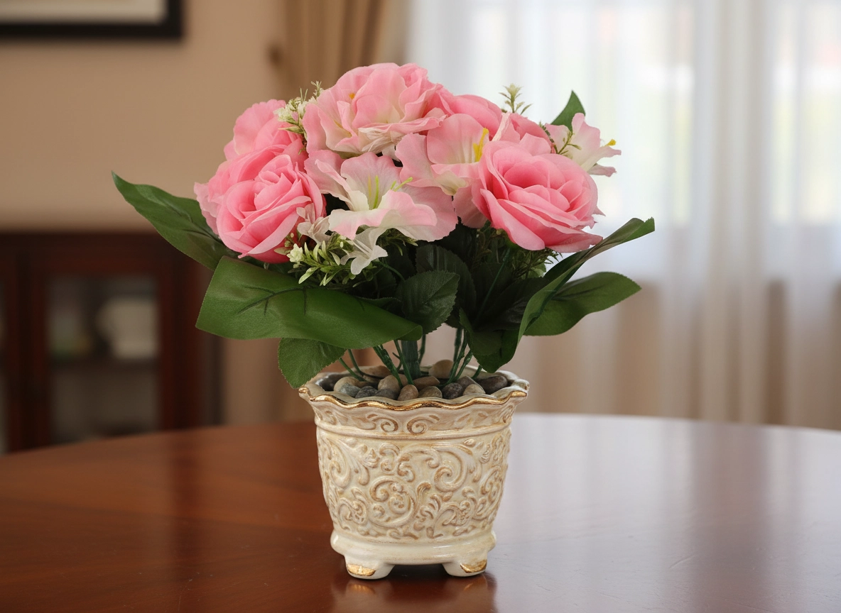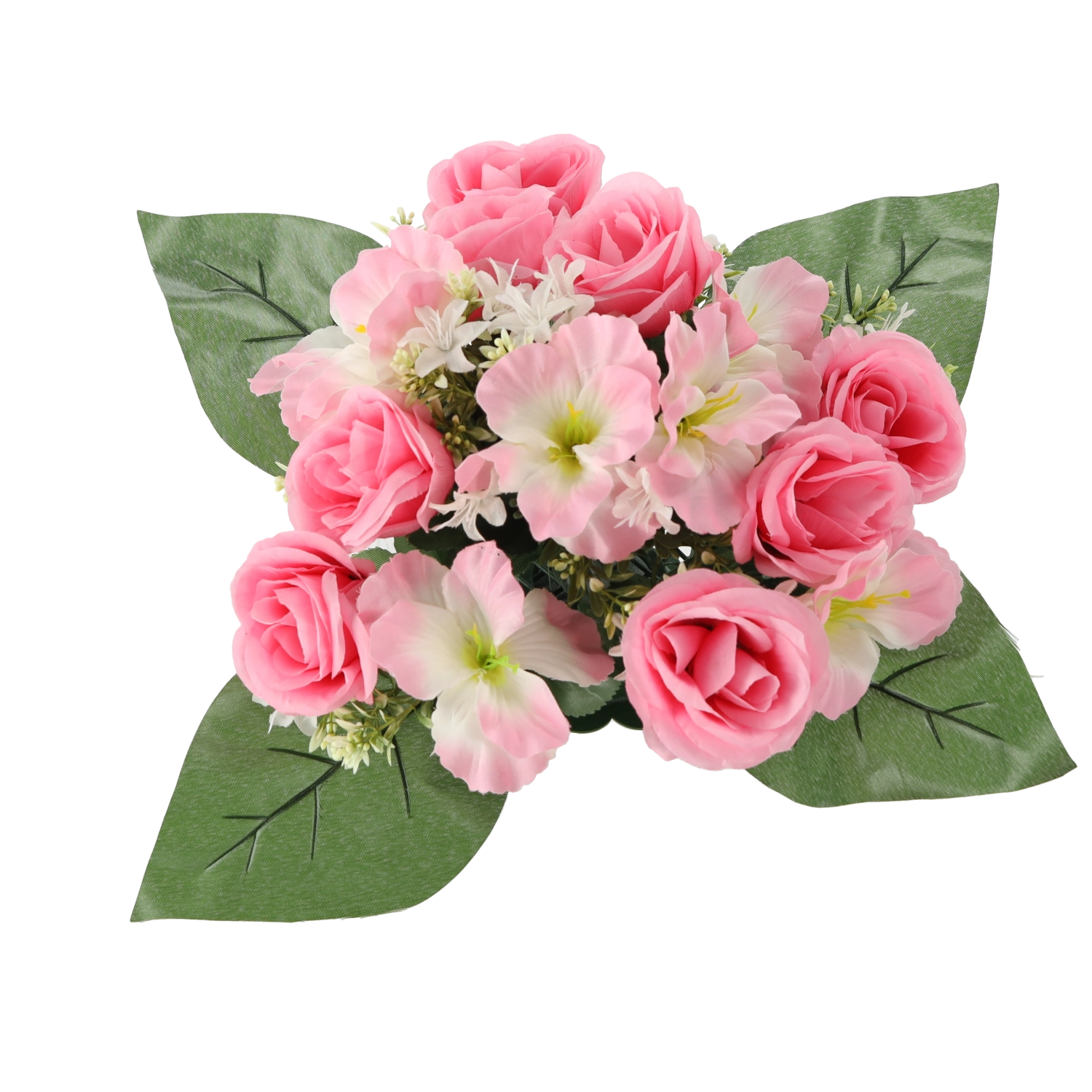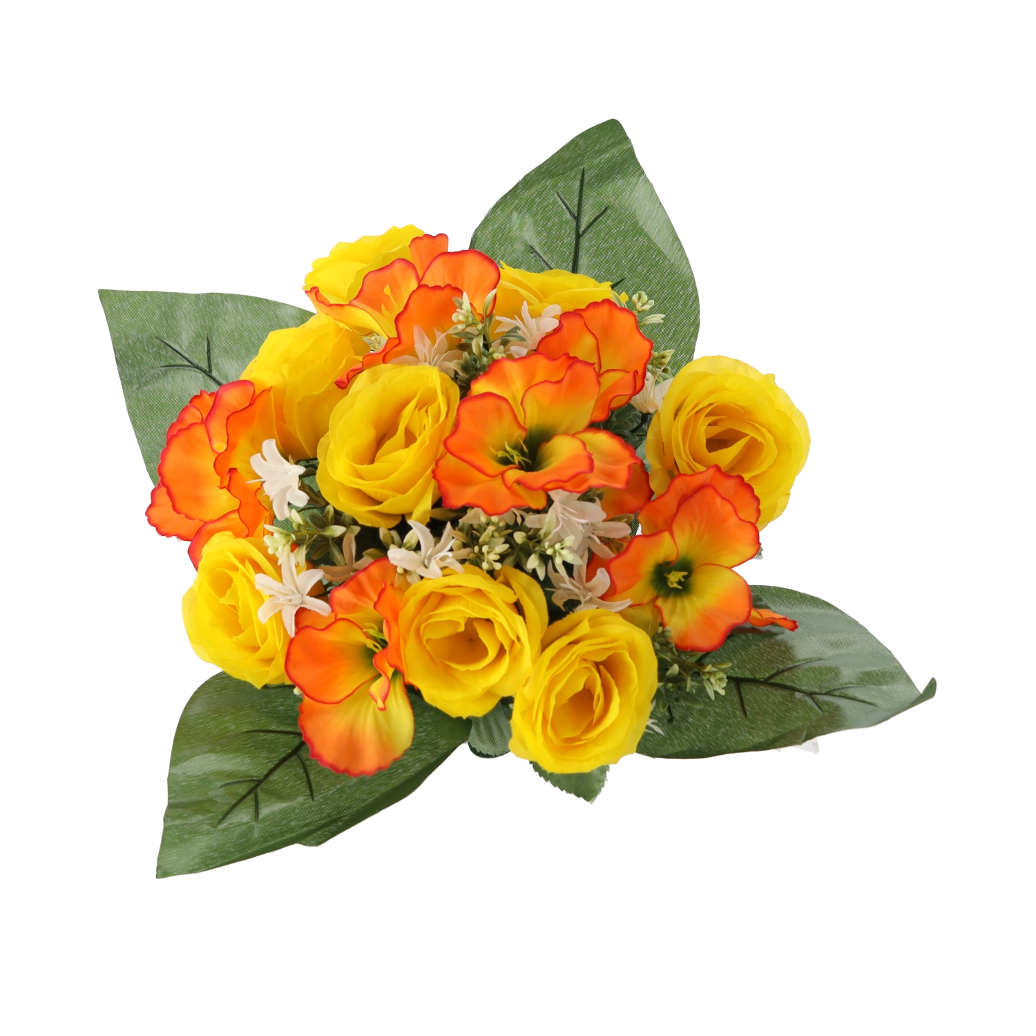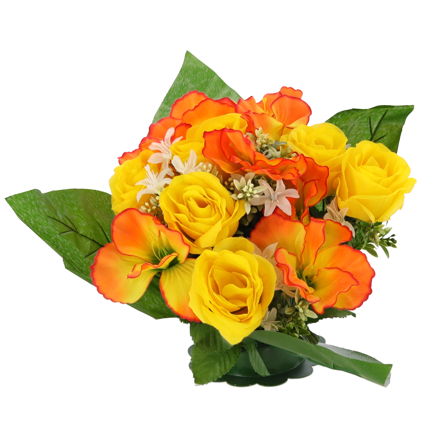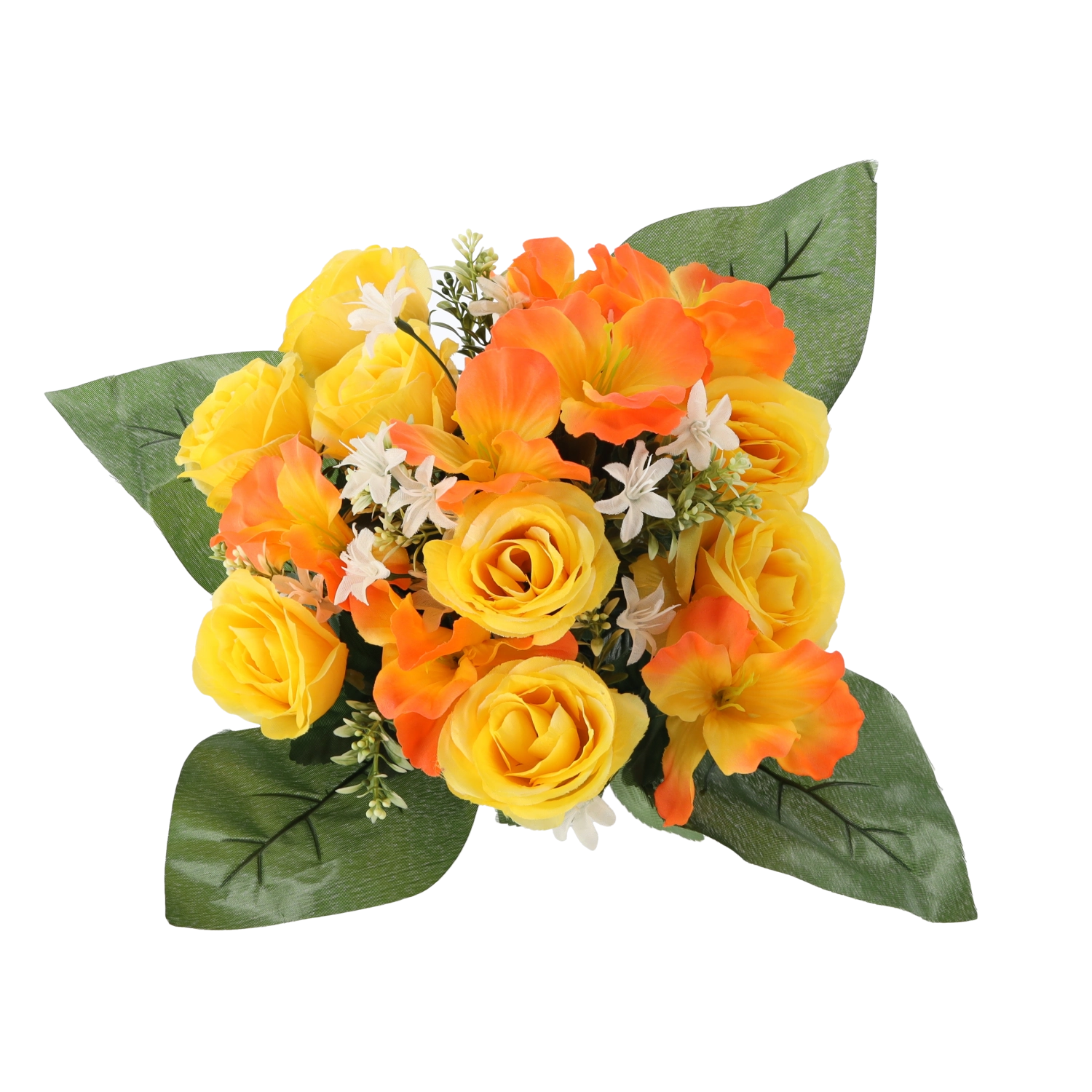 V dom ali pisarno vnesite svež pridih cvetja brez skrbi. Umetni šopek z vrtnicami in hibiskusom izstopa z zvestim videzom cvetnih listov in listja, stabilno obliko in intenzivnimi barvami, ki ne zbledijo. Kompaktna velikost je kot nalašč za mizo, komodo, recepcijo ali mesto spomina.