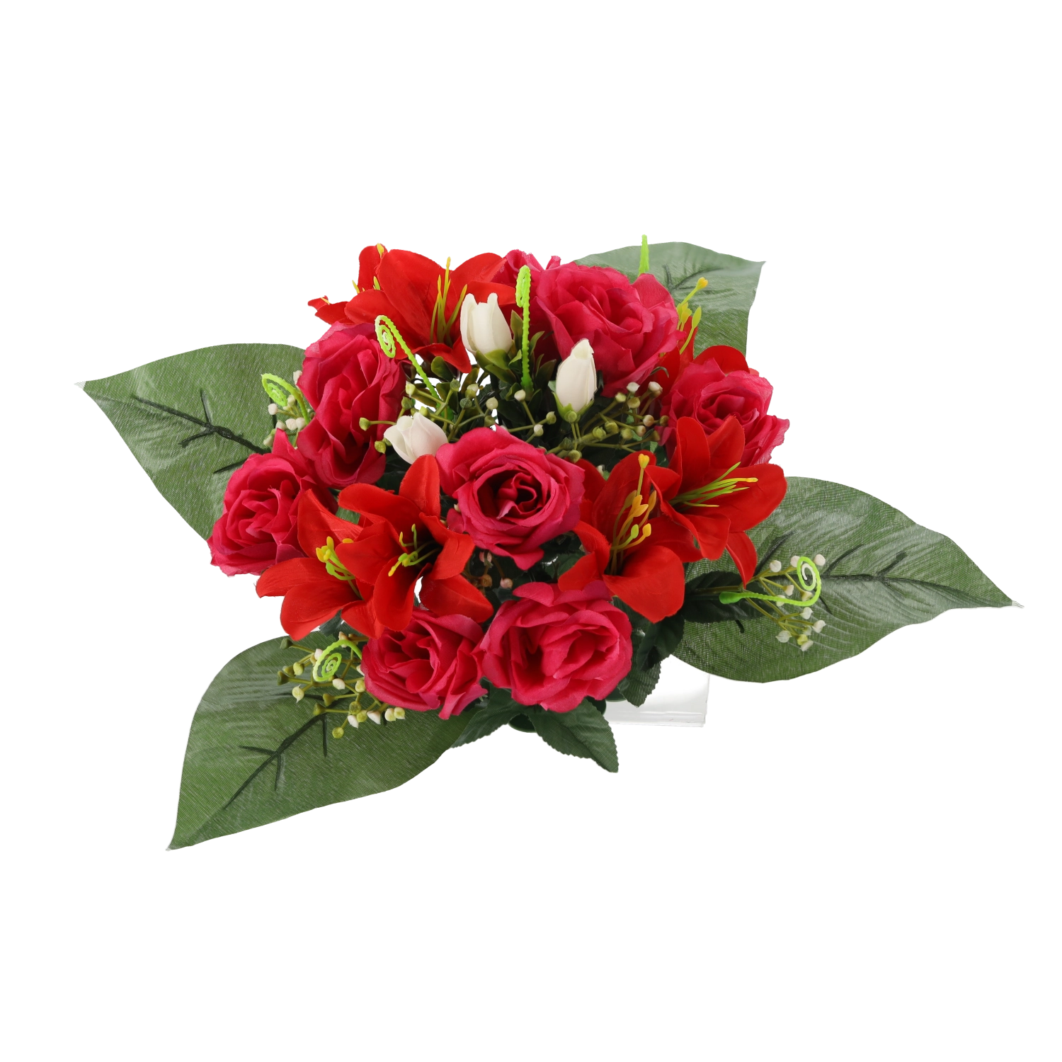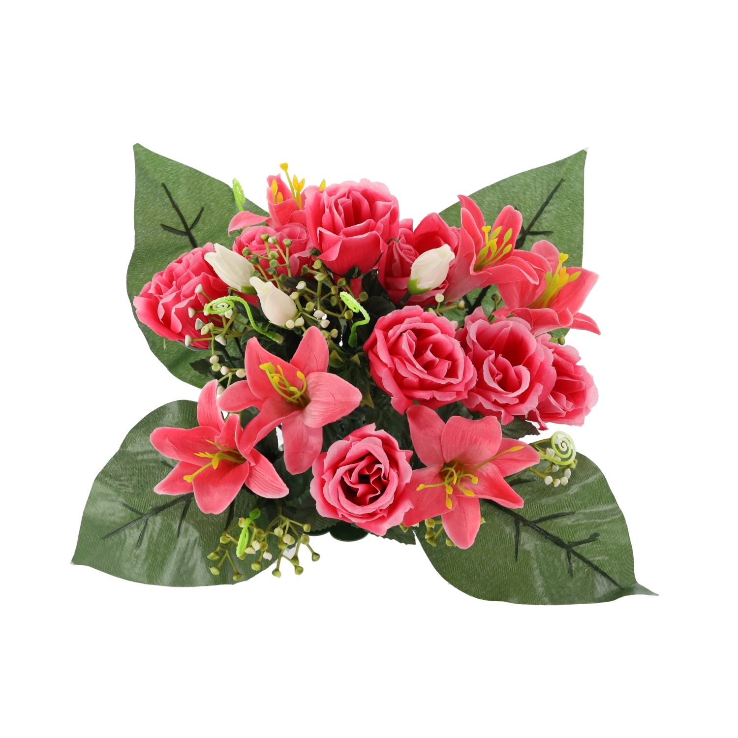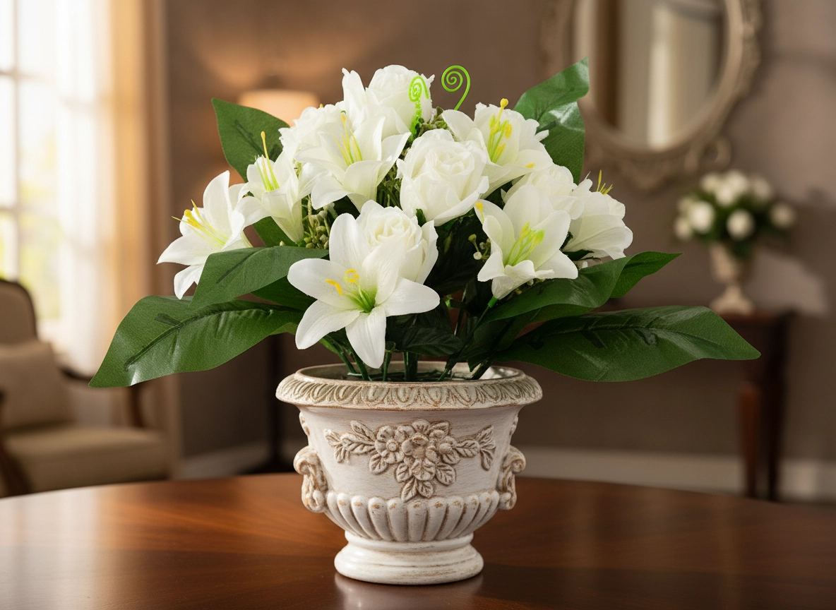 Ta stilska umetna cvetlična aranžma združuje brezčasno lepoto vrtnic in lilij z bogatim zelenjem za naraven videz. Zahvaljujoč kompaktnih dimenzijam 25 × 27 × 27 cm se zlahka prilega na mizo, komodo ali okensko polico ter prostoru takoj doda svež in urejen vtis.