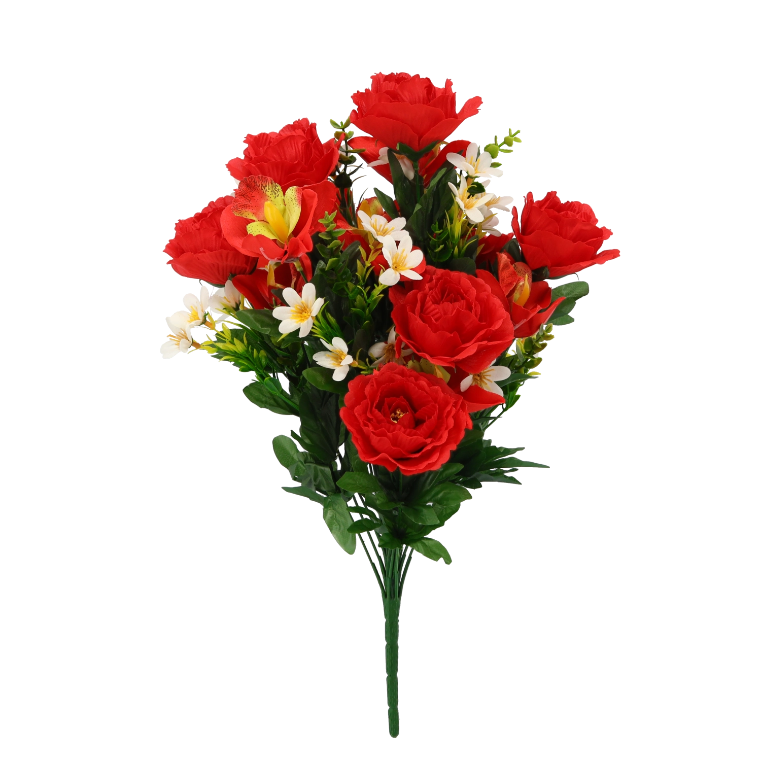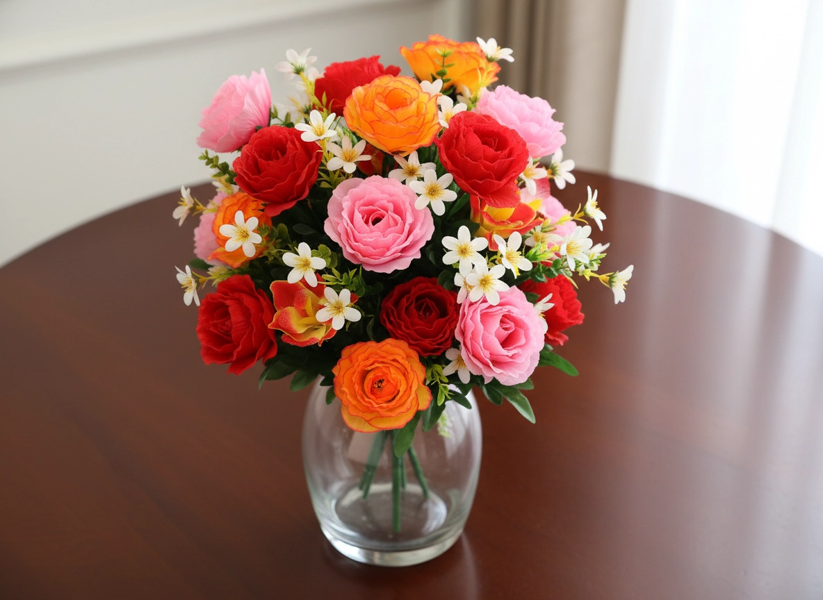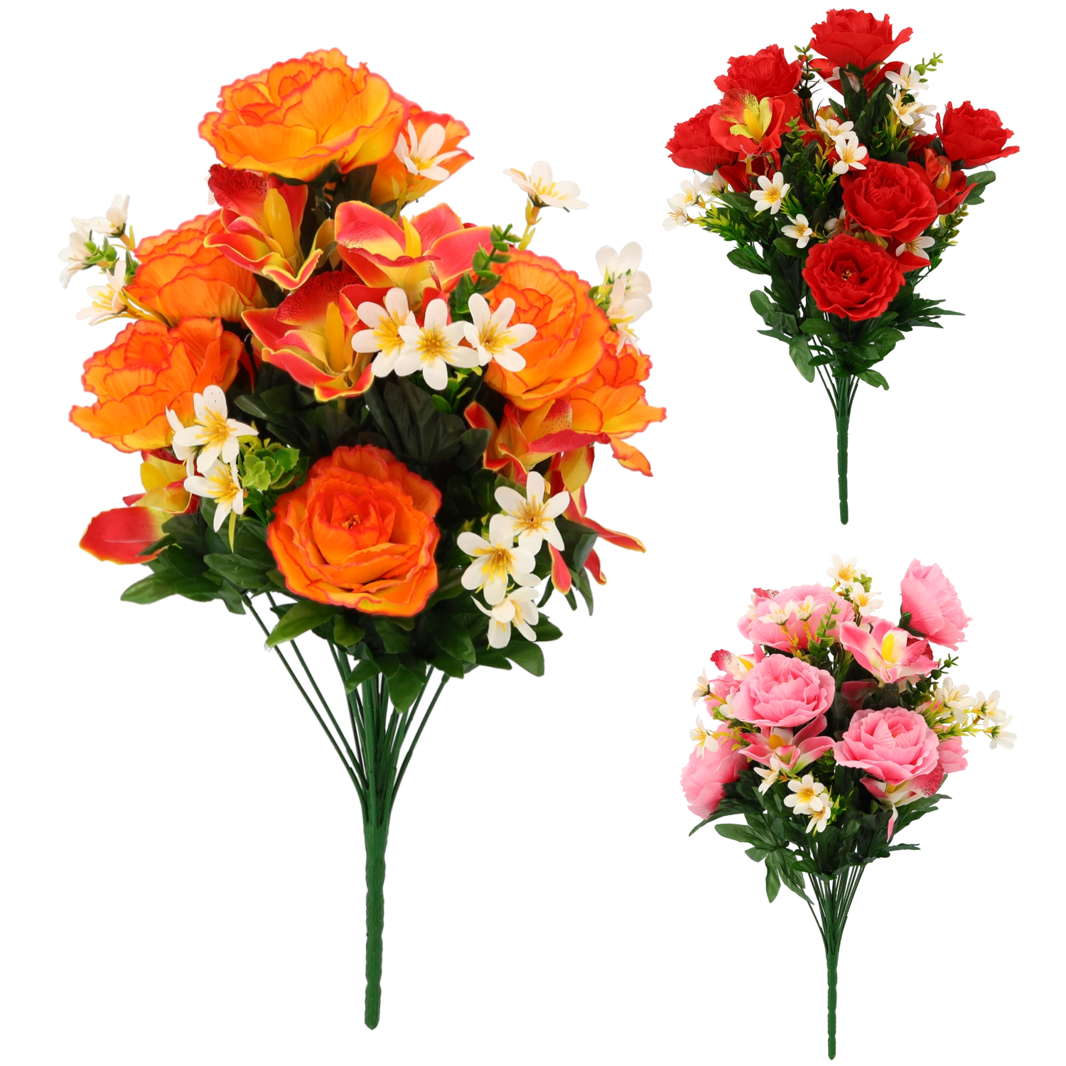 Eleganten umetni šopek s kombinacijo vrtnic, orhidej in drobnih belih cvetkov v mešanici barv (rdeča, rožnata, oranžna). Ponuja realistične podrobnosti, dolgo življenjsko dobo brez vzdrževanja in takoj poživi notranjost ter slovesno dekoracijo.