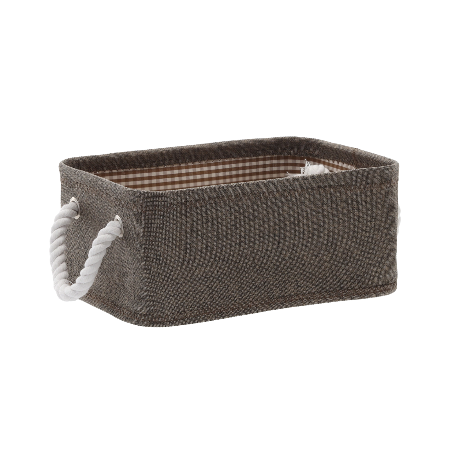 Nevtralna rjava tkanina in nežna karirasta podloga dopolnita moderen interier ter pomagata ohranjati red na policah in komodah.