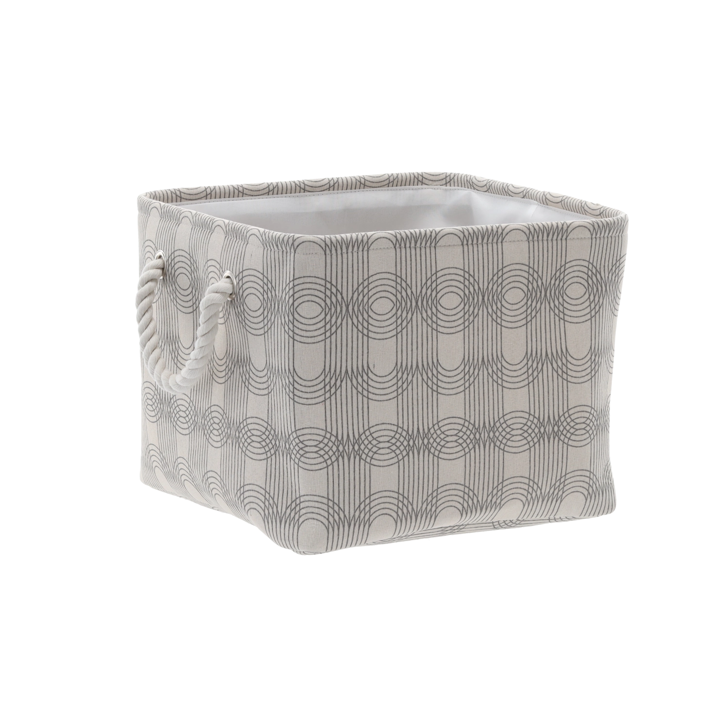 Vrvnati ročaji omogočajo udobno prenašanje, ne glede na to, ali je škatla prazna ali polna. Siv geometrijski vzorec in dekorativna podloga prostoru dodata čist, urejen videz. Idealna za dnevno sobo, spalnico, kopalnico, otroško sobo in delovni kabinet.