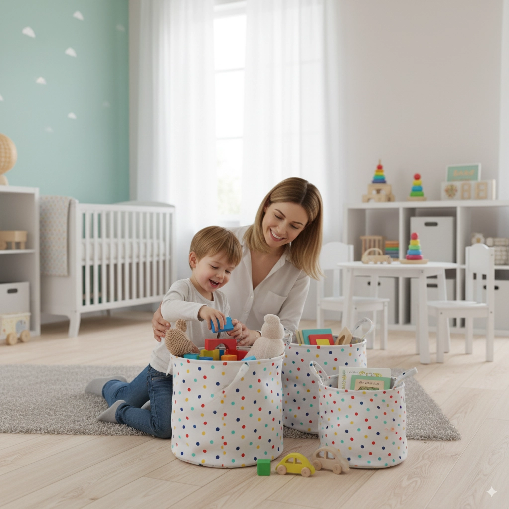 Zaradi tekstilne konstrukcije in dveh stranskih ročajev košaro zlahka prenesete iz kopalnice v otroško sobo ali pralnico, tudi ko je polna perila ali igrač.
