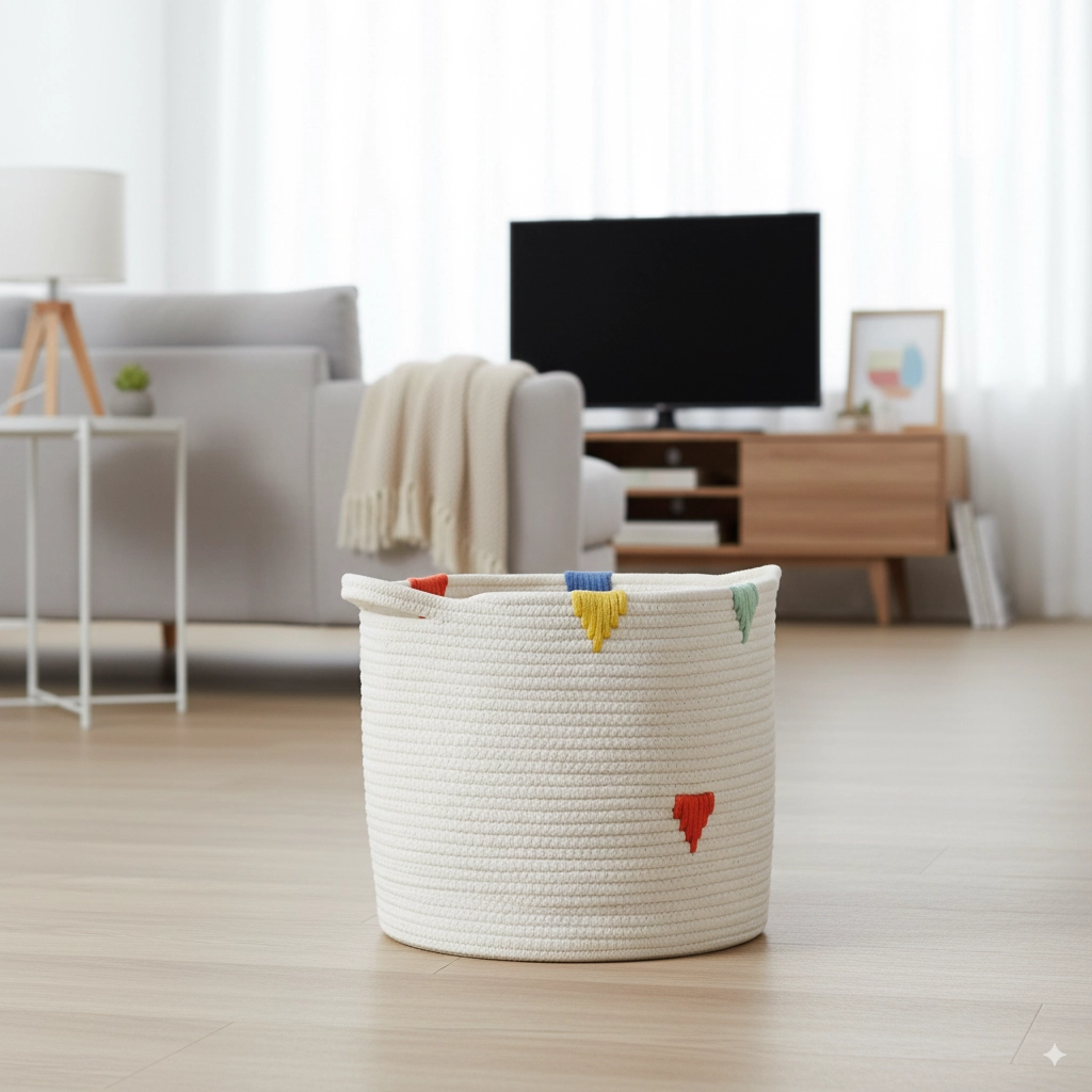 Košara je lahka, a obstojna, zato jo je preprosto prenašati. Ko je ne potrebujete, jo zlahka zložite na ravno in pospravite – popolna rešitev za manjša stanovanja. Barvni detajli prostoru dodajo prijetno, živahno vzdušje.