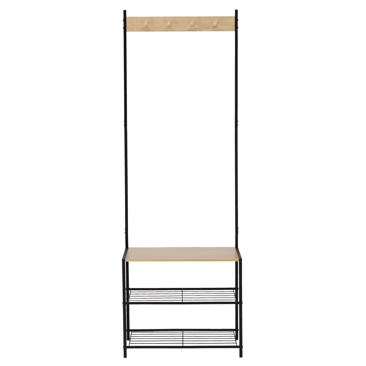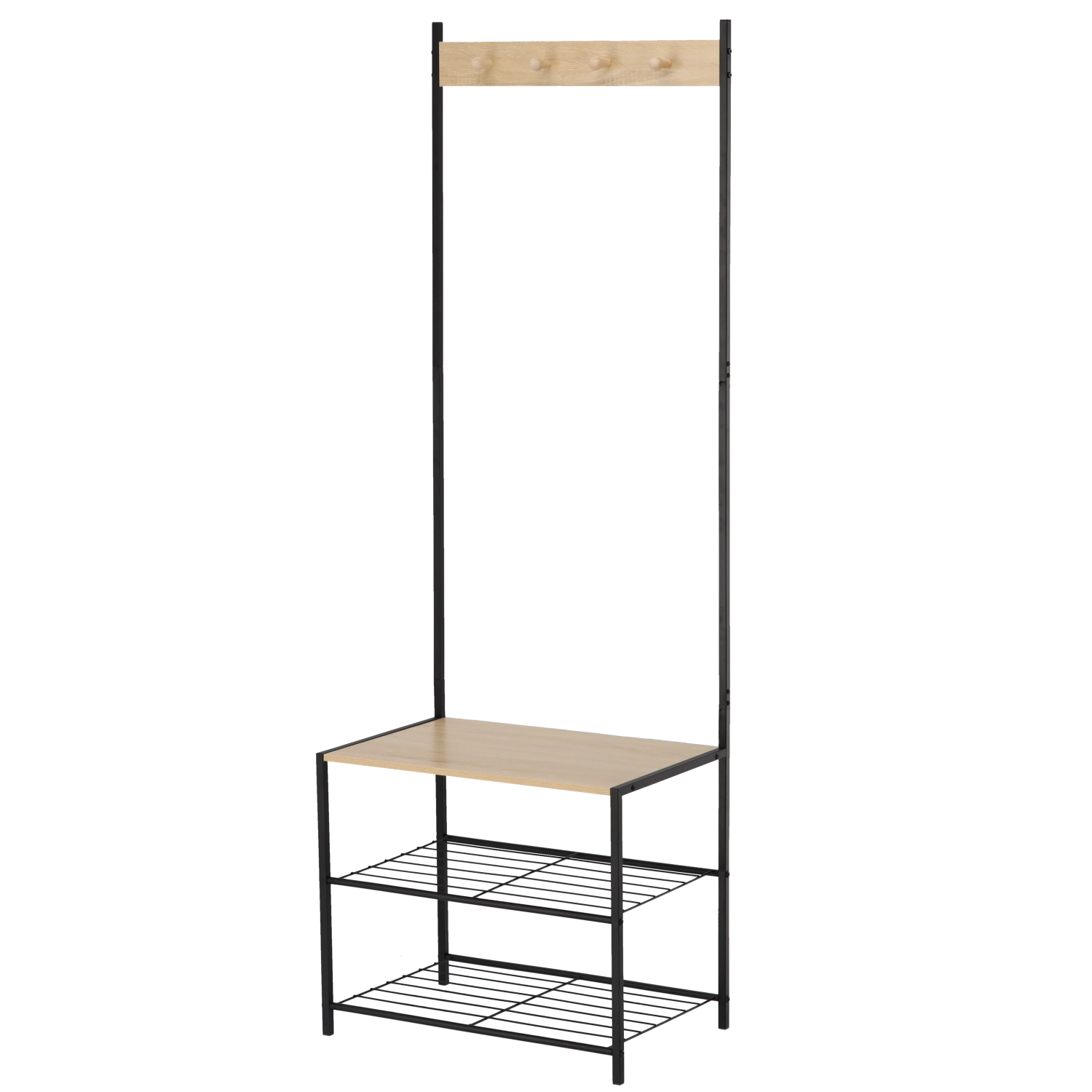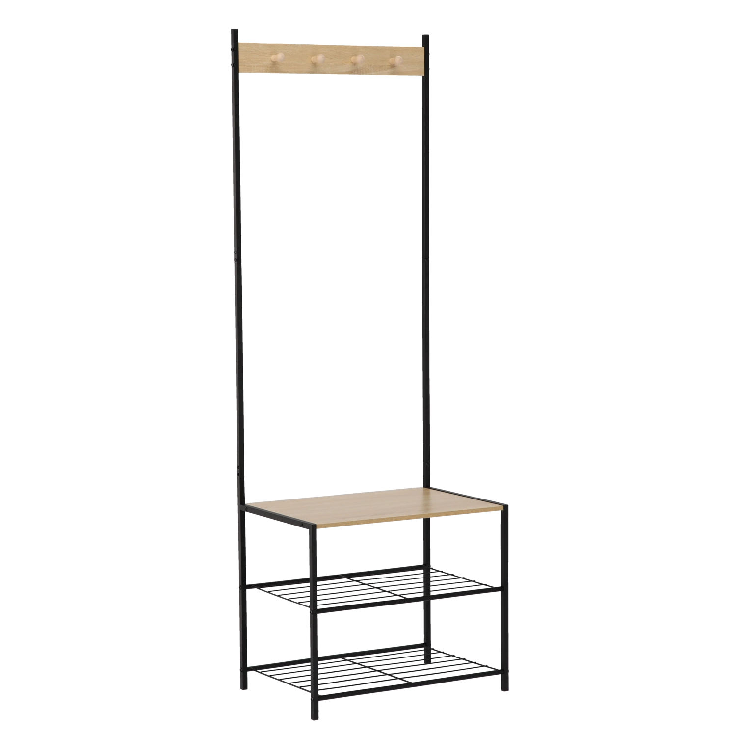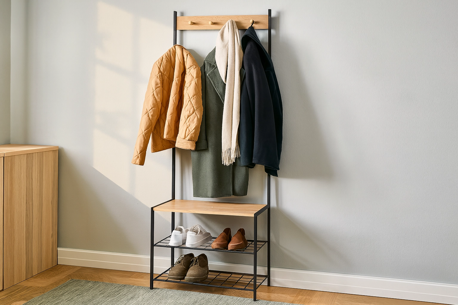 Masiven okvir iz lakirane kovine zagotavlja stabilnost in dolgo življenjsko dobo, leseni poudarki pa dodajo topel loft videz. Dve spodnji kovinski polici sprejmeta več parov čevljev, medtem ko zgornja letvica s kljukicami poskrbi, da so jakne, šali in torbice pregledno na enem mestu.