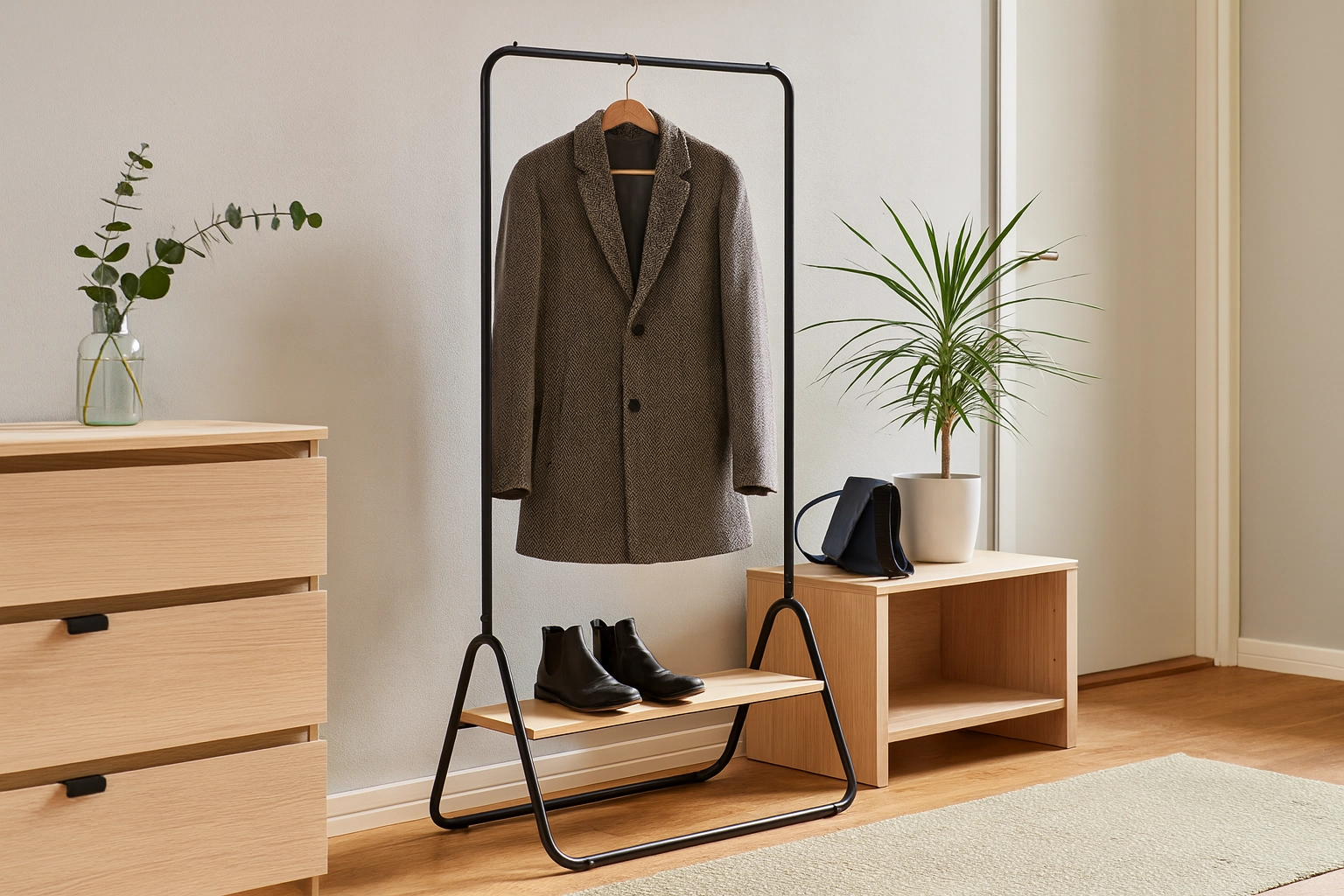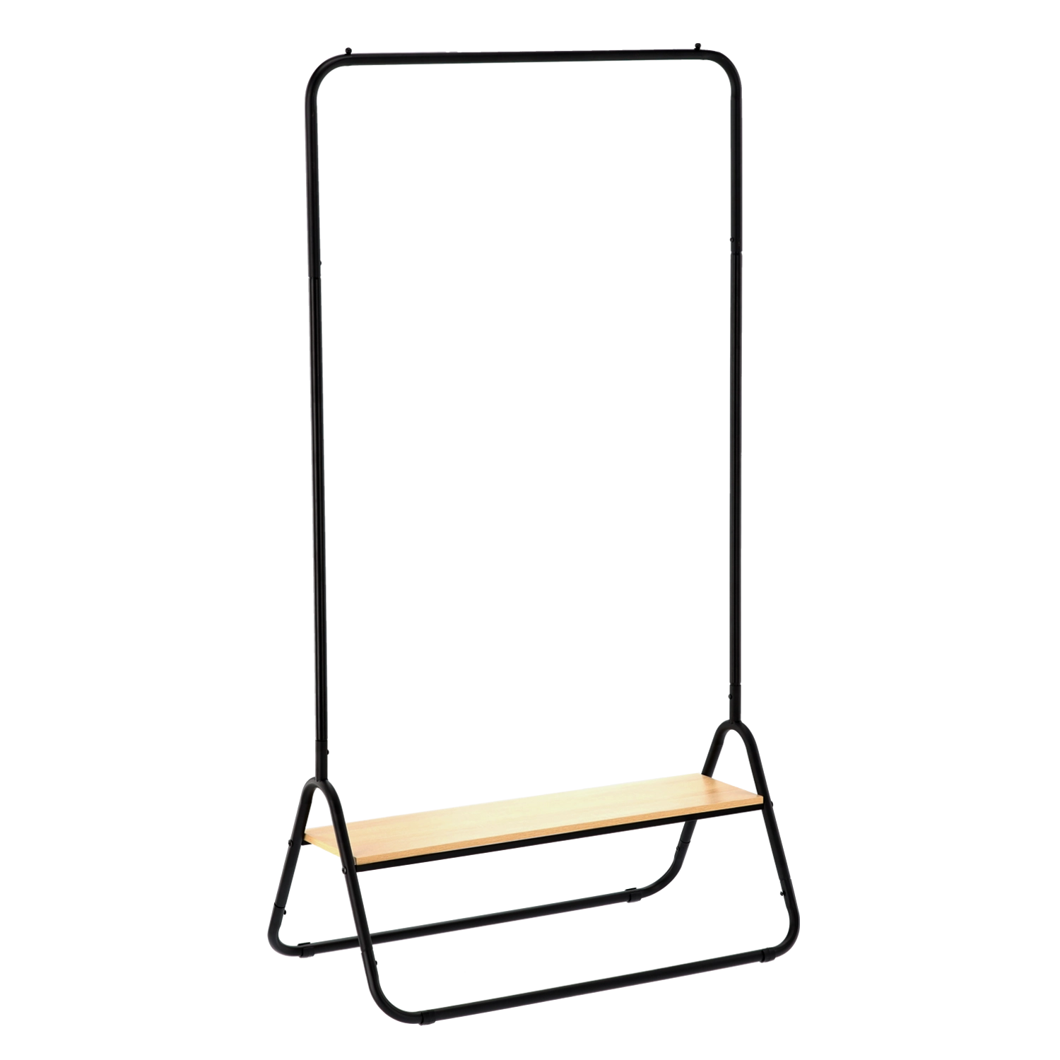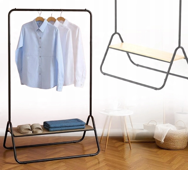 Spodnja polica iz MDF debeline 12 mm je idealna za čevlje, torbe in shranjevalne koše, medtem ko zgornja palica sprejme vsakodnevna oblačila in tudi bolj voluminozne plašče. Praškasto lakiranje povečuje odpornost proti praskam in koroziji, zato bo stojalo zdržalo dolgotrajno uporabo.
