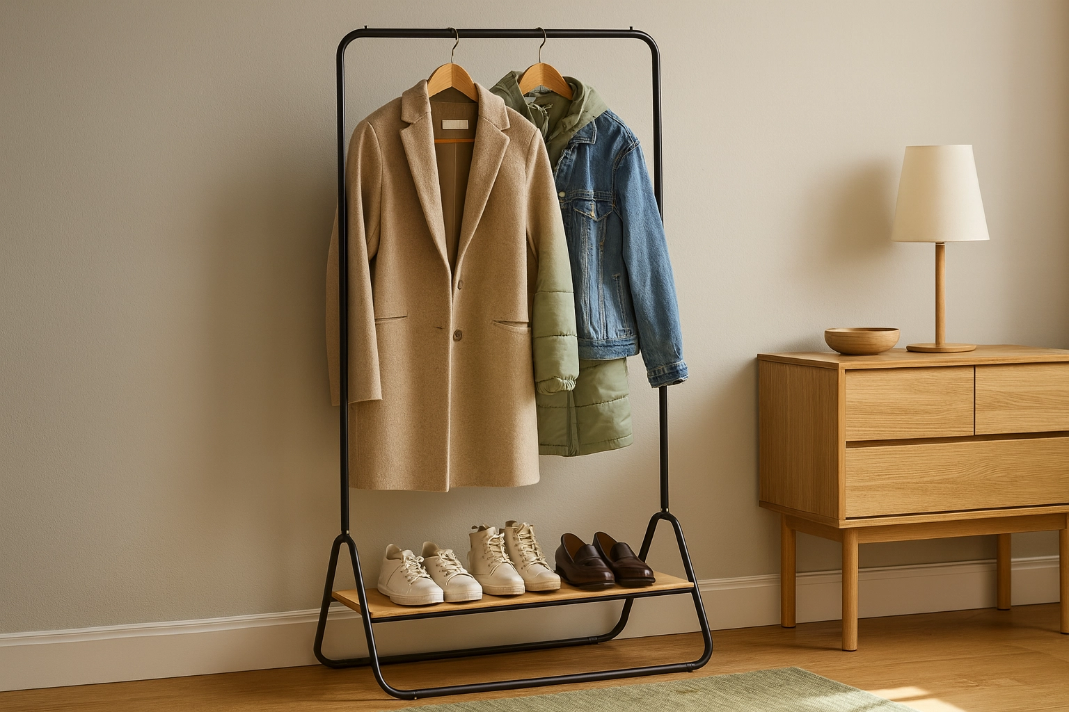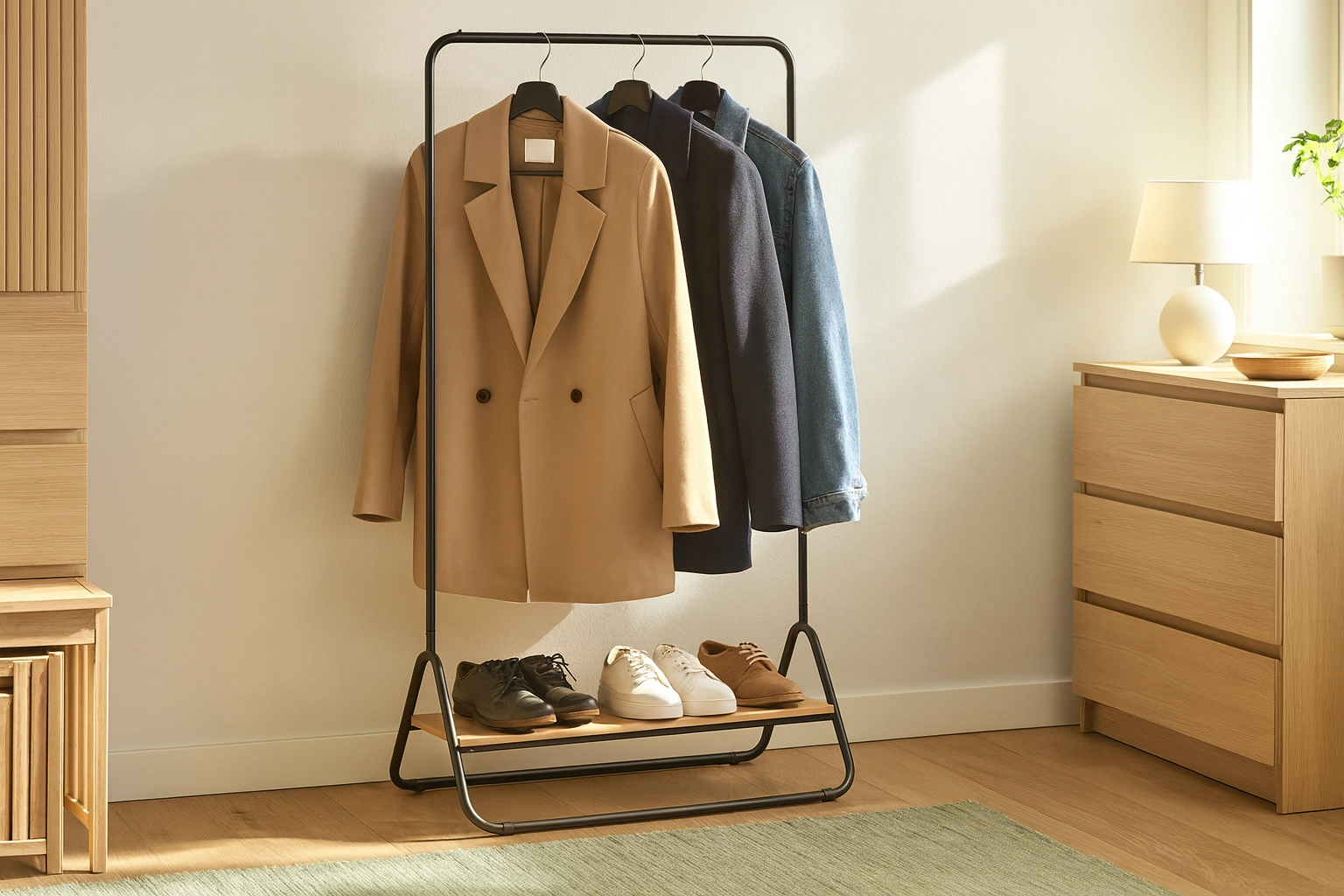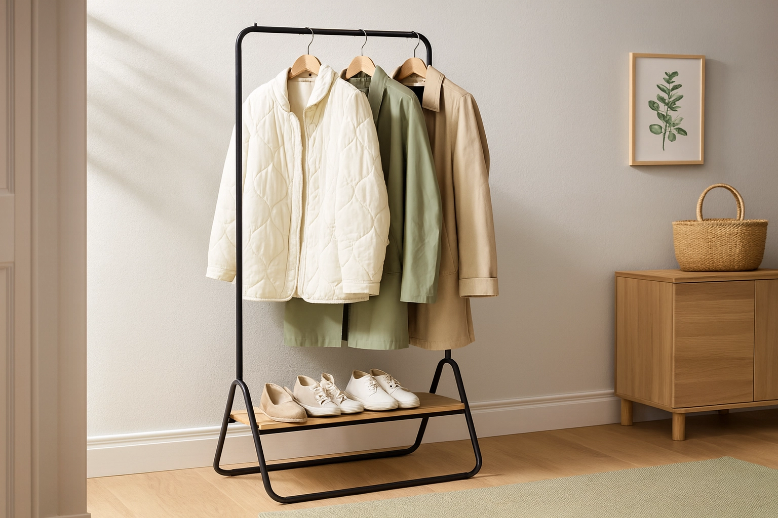 Spodnja polica iz MDF debeline 12 mm je idealna za čevlje, torbe in shranjevalne koše, medtem ko zgornja palica sprejme vsakodnevna oblačila in tudi bolj voluminozne plašče. Praškasto lakiranje povečuje odpornost proti praskam in koroziji, zato bo stojalo zdržalo dolgotrajno uporabo.