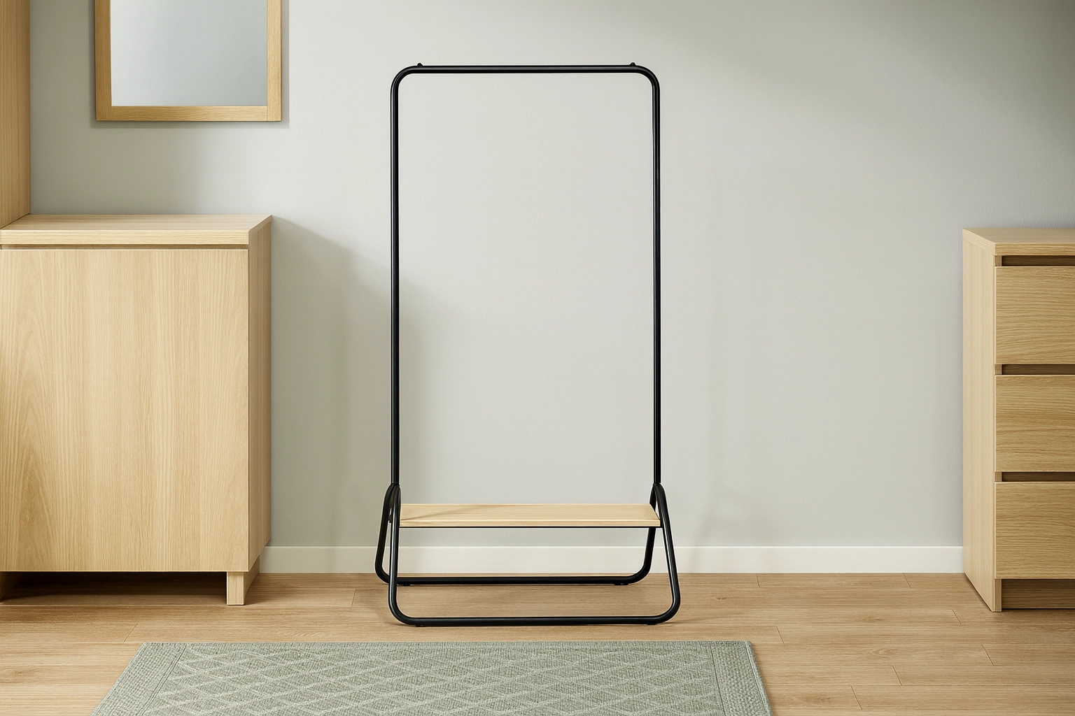 Ohranite red z minimalističnim stojalom, ki združuje funkcionalnost in sodoben videz. Črna kovina v kombinaciji z lesnim dekorjem se poda v vsak interier – od modernega do klasičnega. Zahvaljujoč prostostoječi konstrukciji ga zlahka postavite tja, kjer ga trenutno potrebujete.