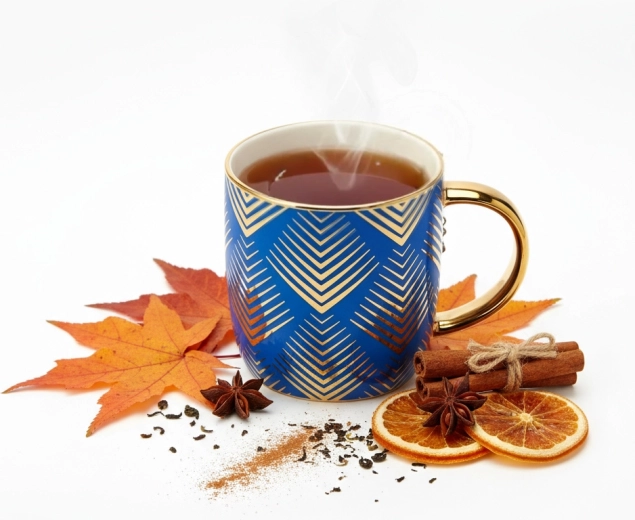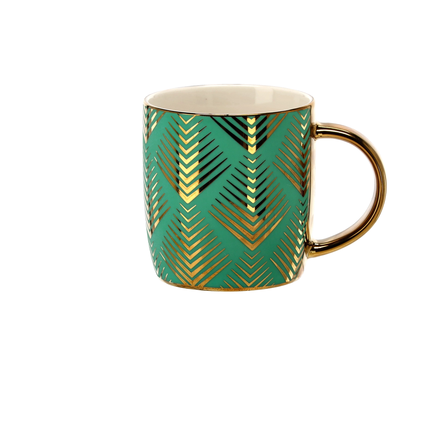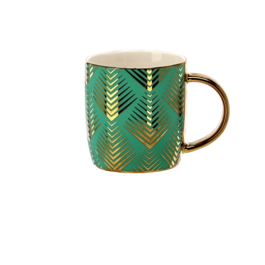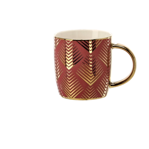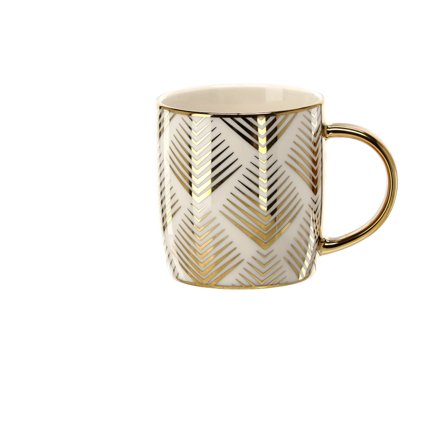 Privoščite si trenutke sprostitve s porcelanasto skodelico, ki združuje eleganten dizajn in praktično funkcionalnost. Zlati poudarki z geometrijskim vzorcem chevron dajejo vrhunski videz, medtem ko udoben ročaj olajša vsakodnevno uporabo.