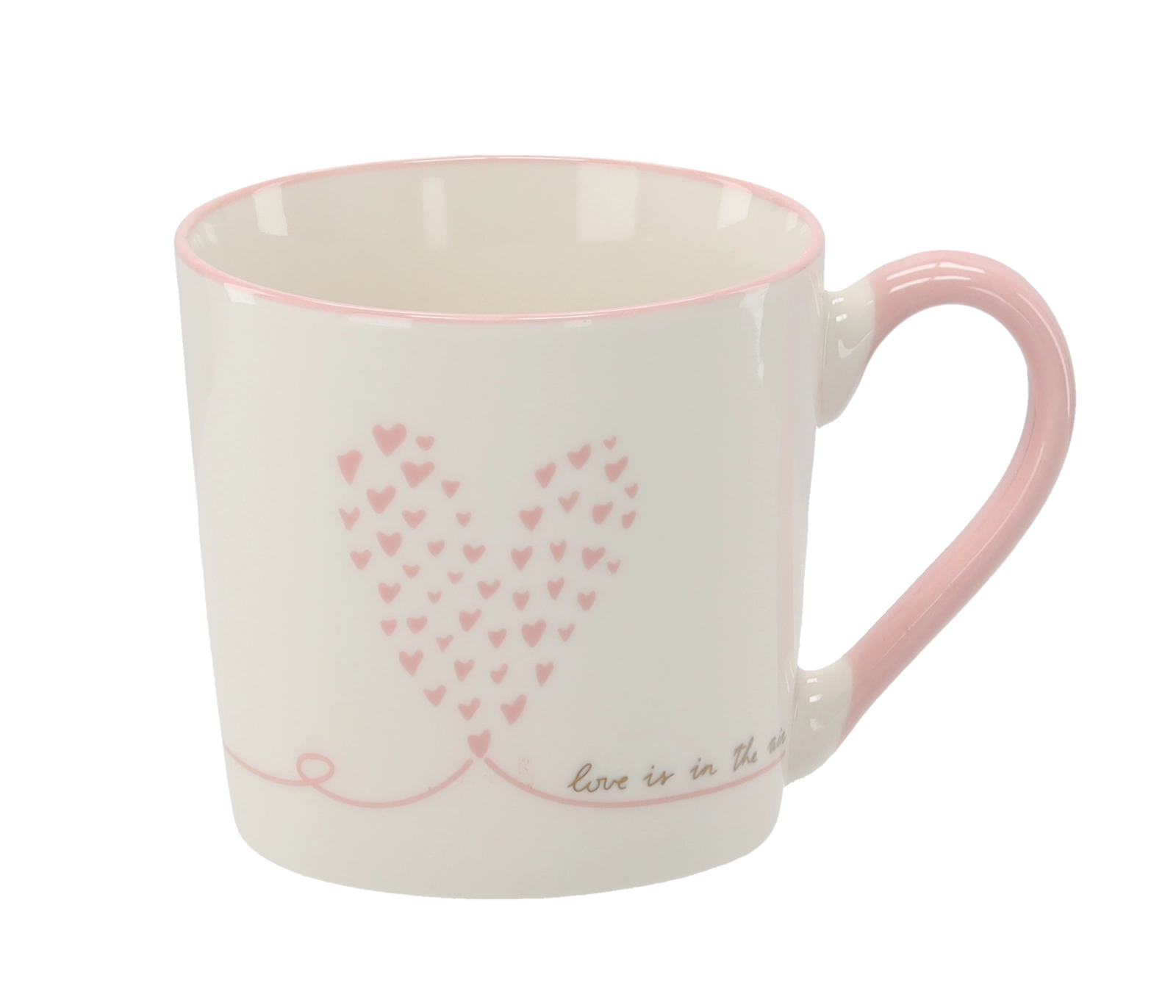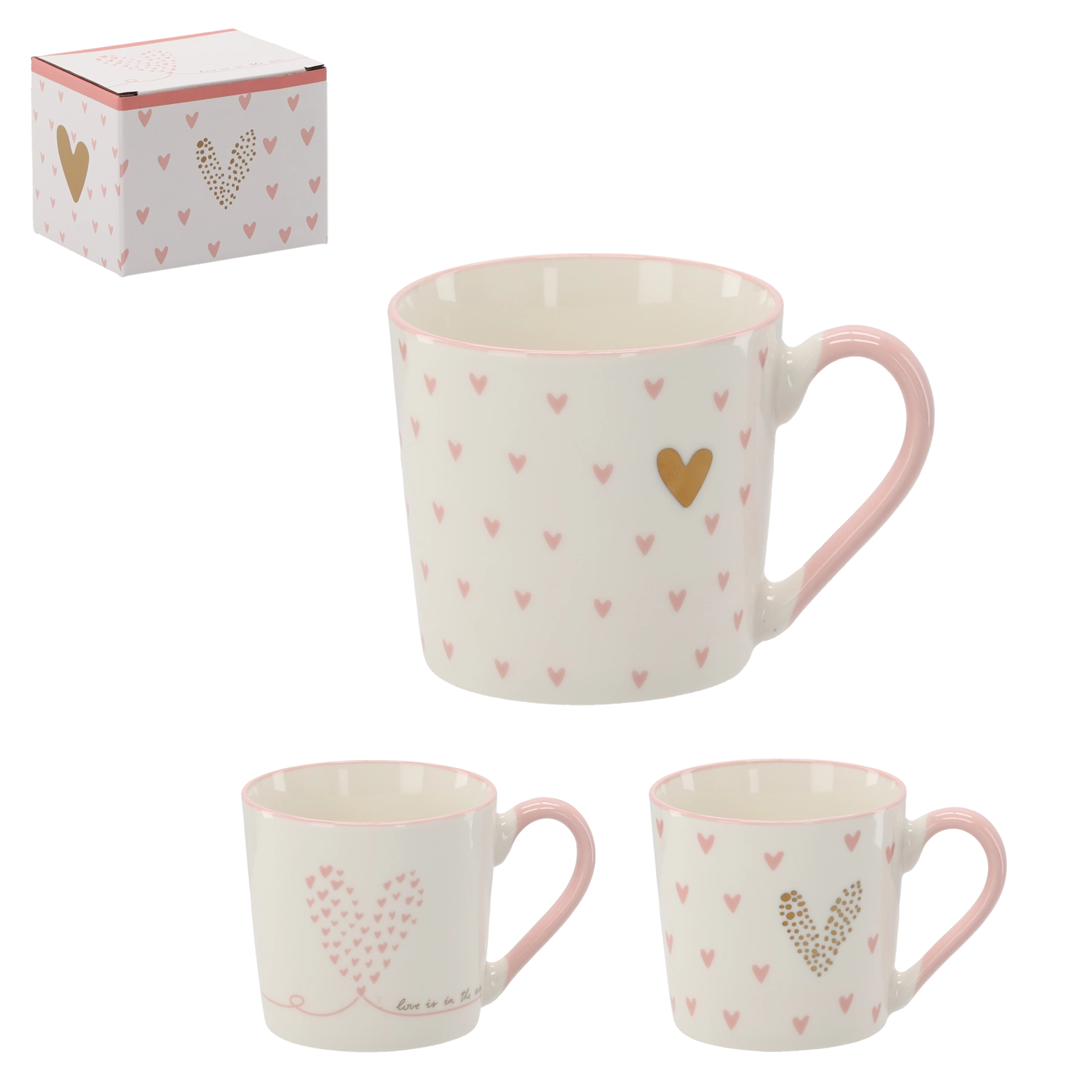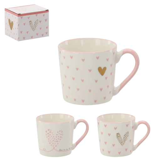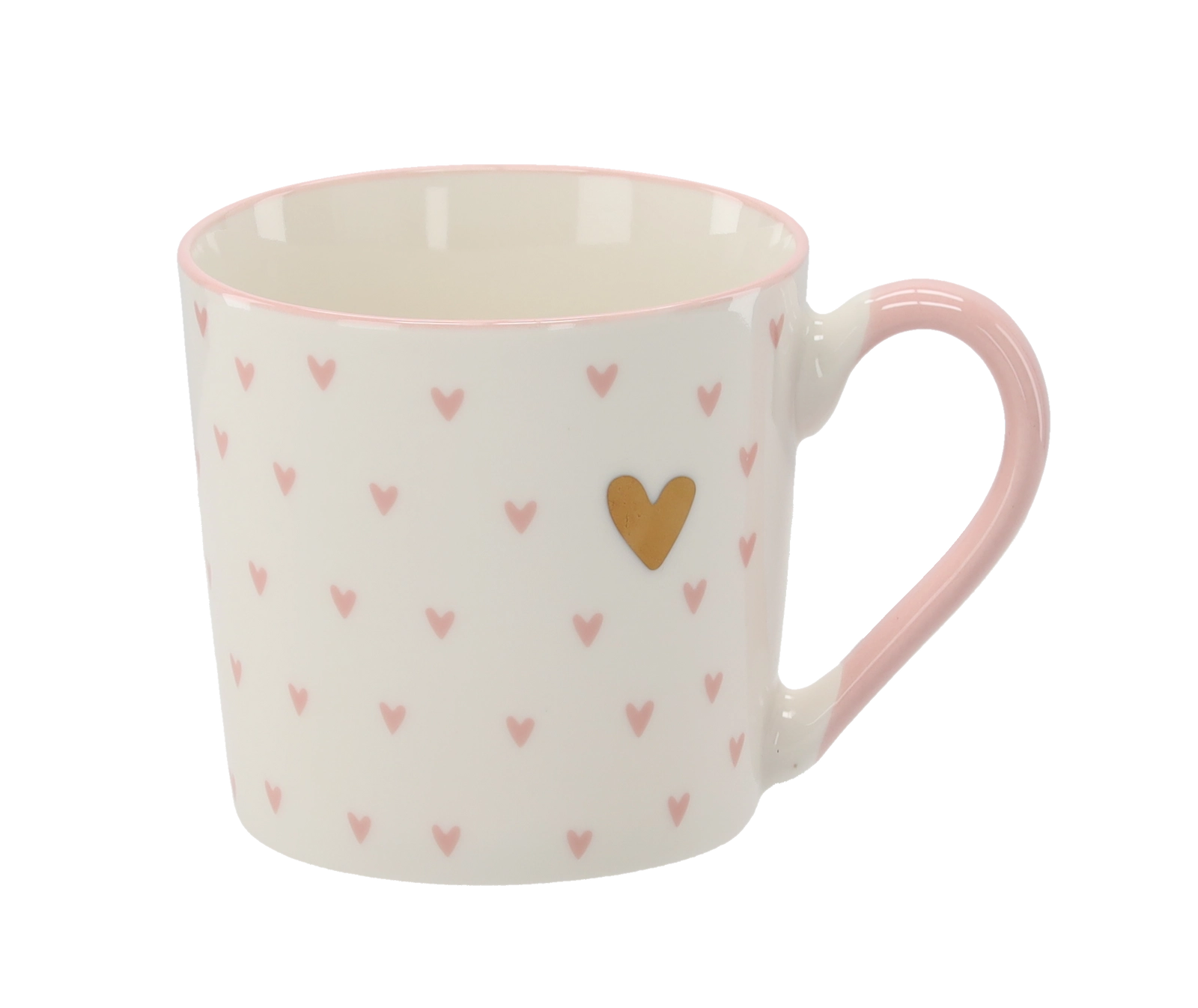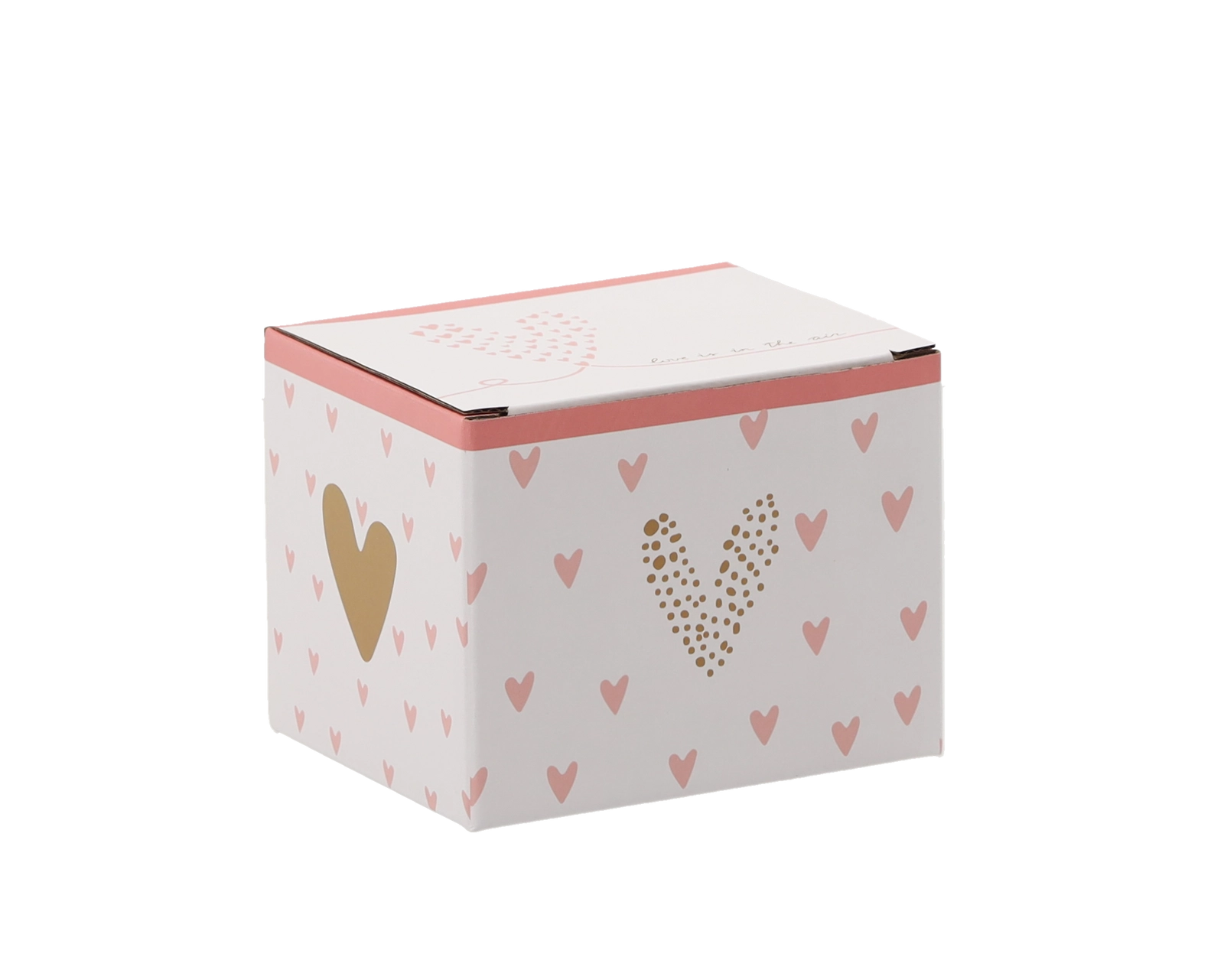 Stilna škatlica z rožnatimi in zlatimi srčki naredi skodelico idealno darilo za vsako priložnost.