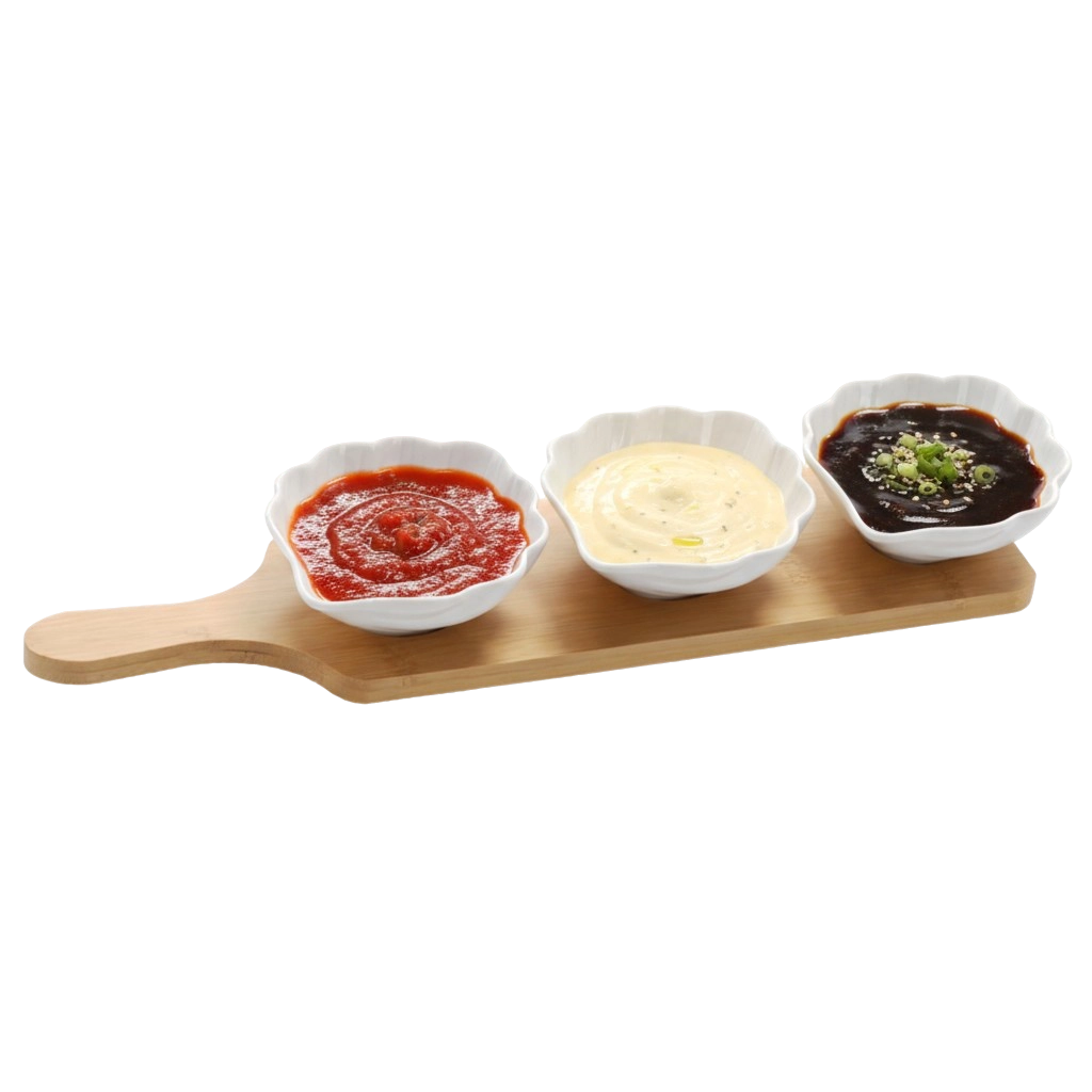 Stilni set treh porcelanastih skledic Kwiat na bambusovi podlagi je idealen za serviranje dipov, omak in prigrizkov. Zaradi cvetlične oblike in bele barve na mizi deluje elegantno, medtem ko bambusova podloga zagotavlja stabilnost in enostavno prenašanje. Kakovosten porcelan zagotavlja odpornost in dolgo življenjsko dobo ter preprosto vzdrževanje.