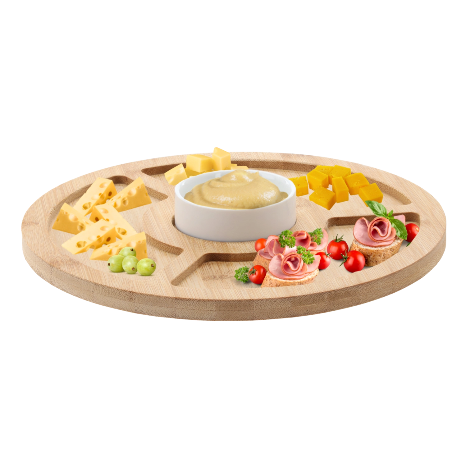 Ta okrogel bambusov servirni pladenj s porcelanasto skledico je odličen za domača pogostitev in družabne dogodke. Zahvaljujoč štirim ločenim razdelkom boste vsak tip prigrizkov obdržali na svojem mestu, medtem ko je sredinska porcelanasta skledica idealna za pomake in omake.