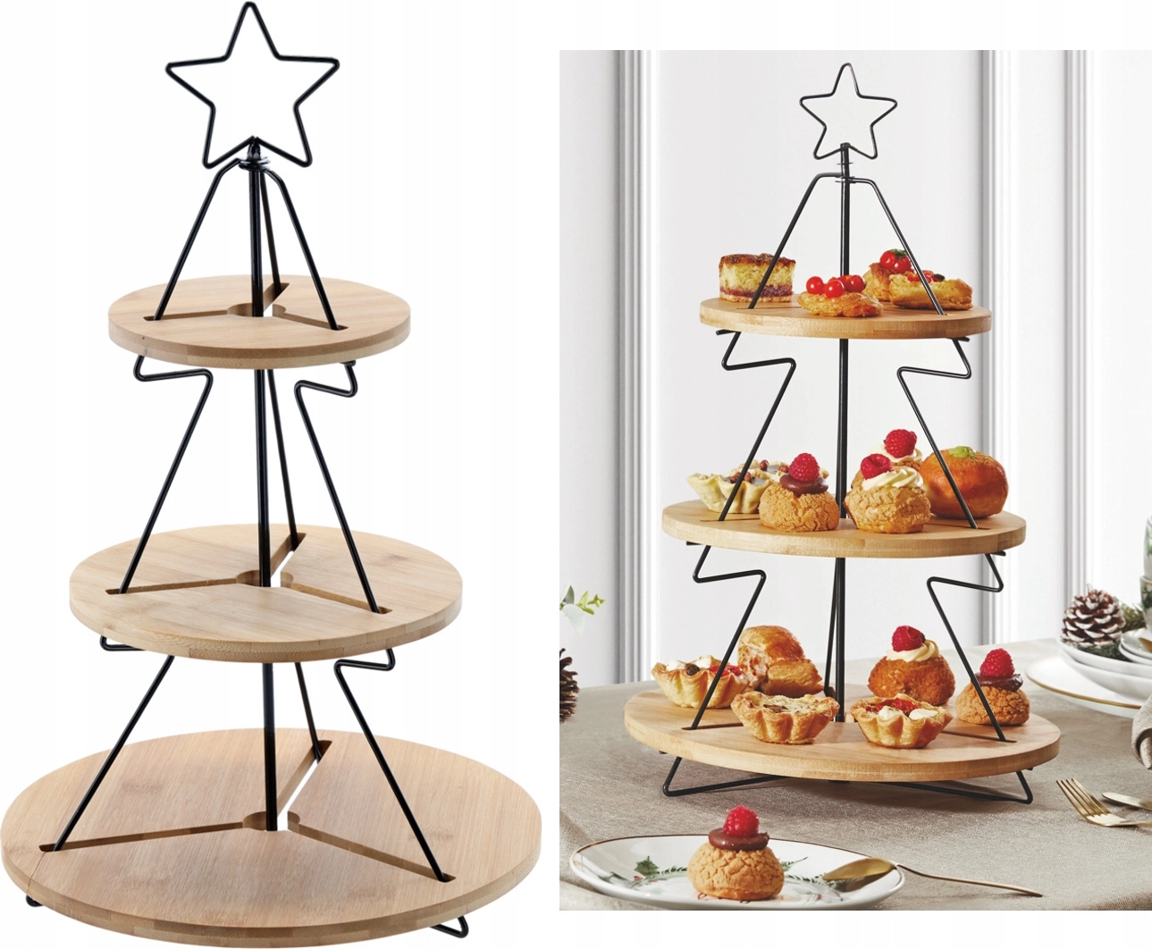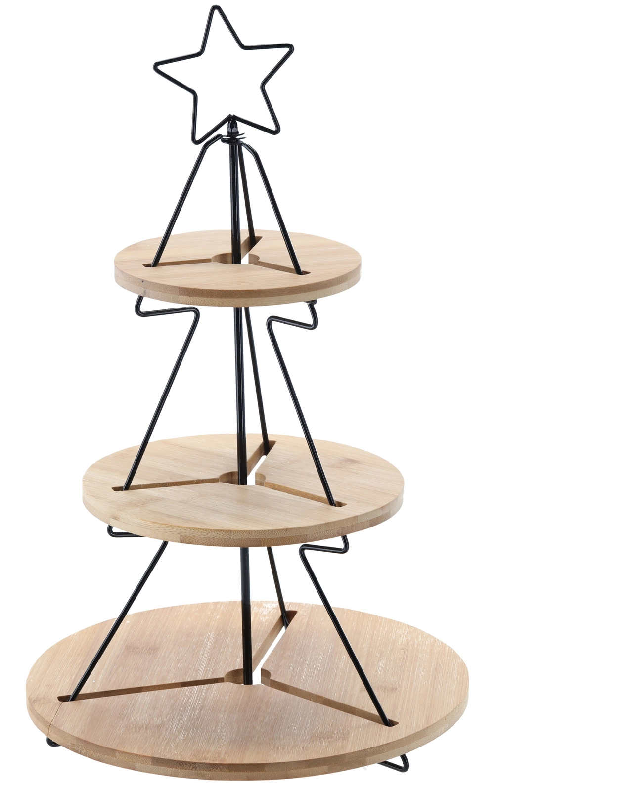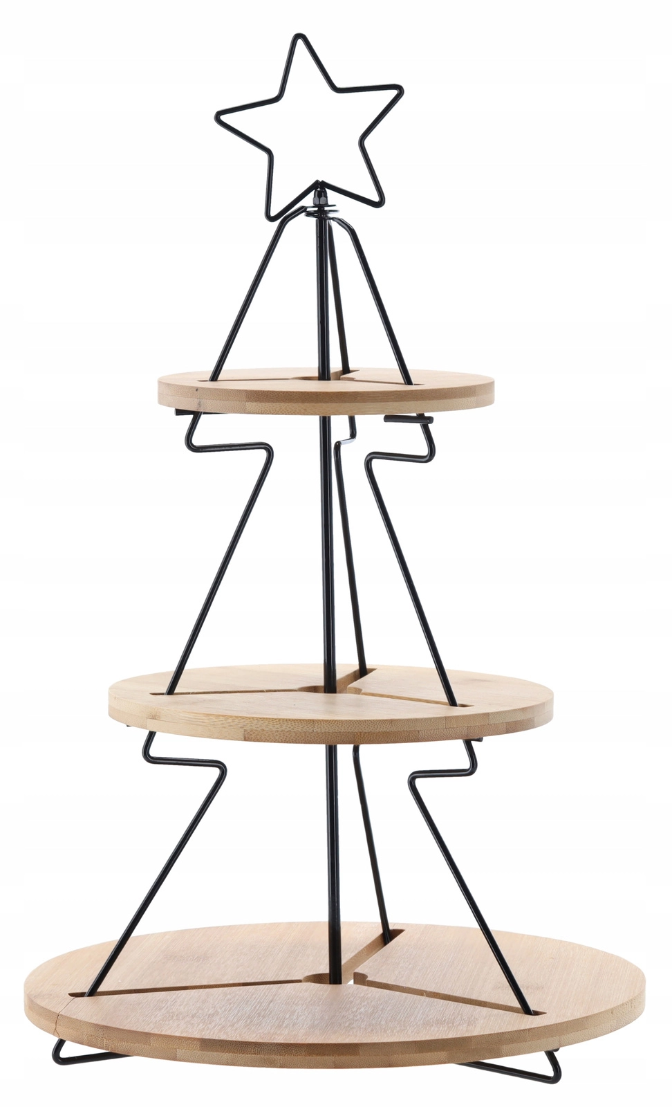 Ta dekorativna in hkrati praktična trinadstropna etažera je idealna za serviranje piškotov, kanapejev, sadja ali cupcakov. Minimalistično kovinsko ogrodje v obliki drevesca z zvezdo ter okrogli bambusovi pladnji ustvarijo takojšnjo praznično čarobnost na vsaki mizi – od družinske večerje do slavnostnega cateringa.