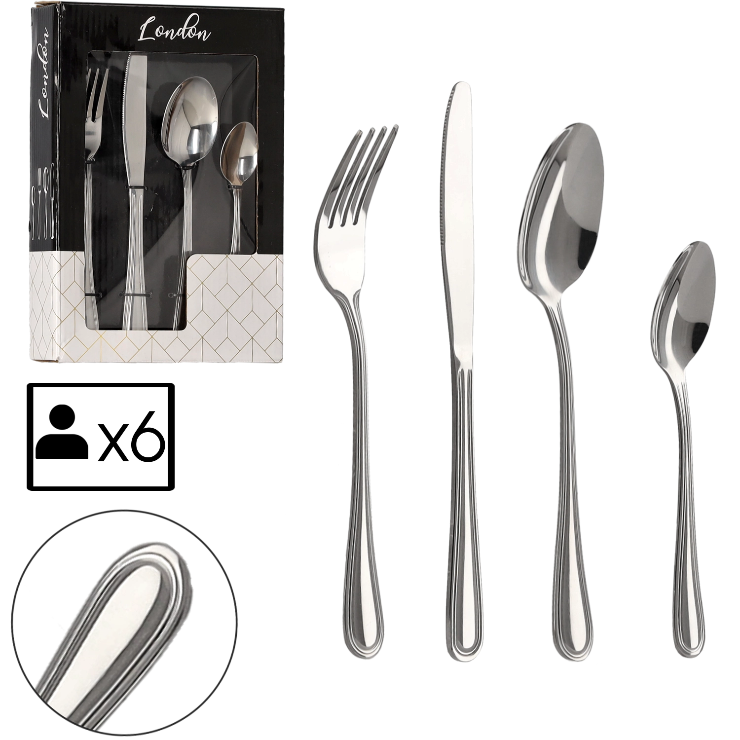 Elegantni set jedilnega pribora London prinaša 24 kosov za vsakodnevno obedovanje in posebne priložnosti. V pakiranju je po 6 nožev, 6 vilic, 6 jušnih žlic in 6 čajnih žličk. Časovno neomejen, klasičen dizajn združuje preprostost, eleganco in kakovostno izdelavo iz trpežnega nerjavnega jekla.
