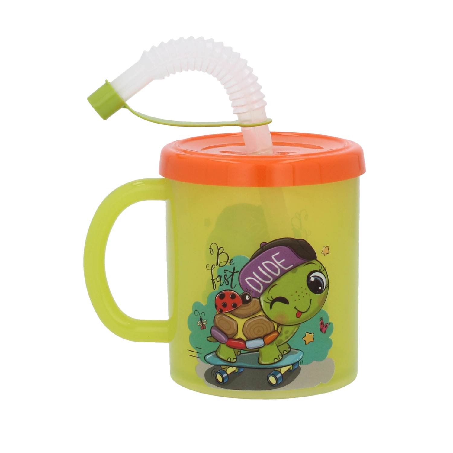 Skodelica ima tesnilni pokrov, ki pomaga preprečevati neželeno politje, ter integrirano prožno slamico z zapiralom za higiensko in enostavno srkanje. Igrivi motivi, kot so žirafa, pingvin ali zajček, spodbujajo samostojnost otrok in naredijo pitje zabavno.