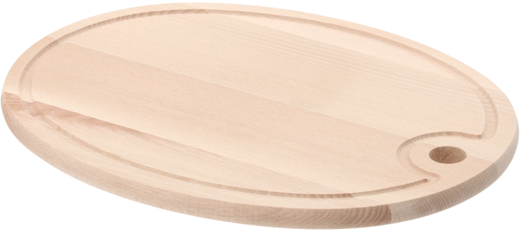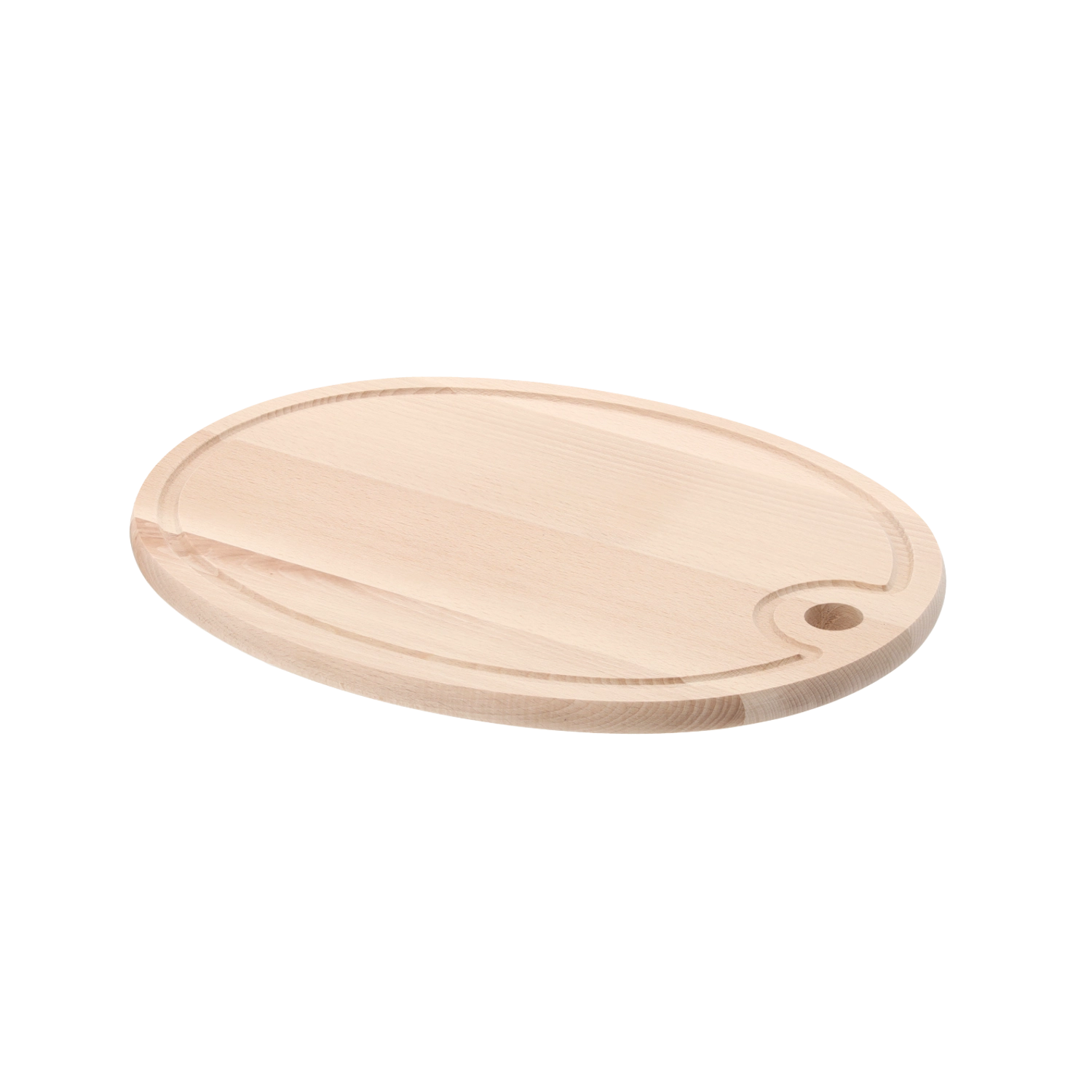 Odkrijte zanesljivo kuhinjsko desko iz trdnega bukovega lesa, ki izstopa po trajnosti in lepi naravni strukturi. Ovalna oblika s praktičnim ušesom olajša rokovanje in prenašanje jedi od priprave do serviranja.