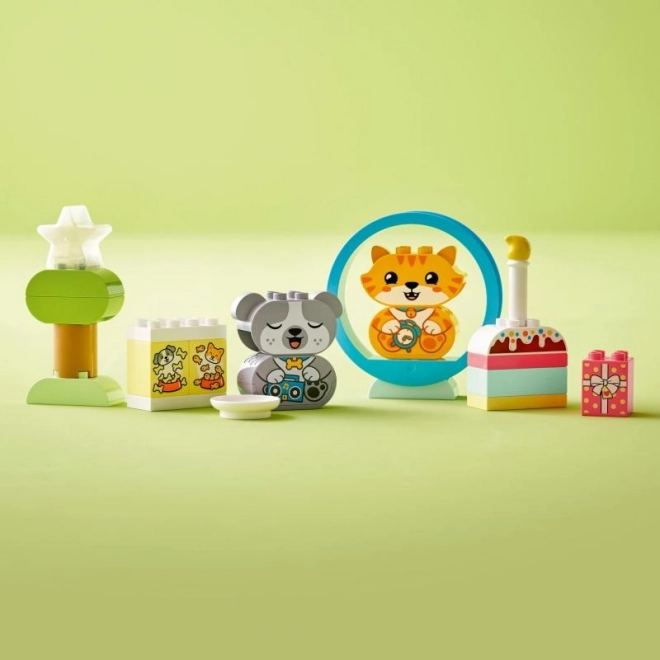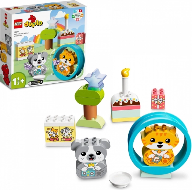Komplet LEGO DUPLO Moj prvi kužek in mucka z zvoki (10977) otrokom od 1,5 leta omogoča odkrivanje sveta skozi igro. Prisrčna modela kužka in mucke lahko otroci preprosto sestavijo iz nekaj kock. Z namestitvijo živalic na vrteči krog se sprožijo zvoki, ki malčkom pomagajo učiti se vsakdanjih dejavnosti, kot so hranjenje, igra ali spanje.