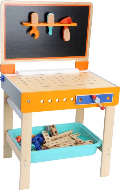 Odkrijte pametno otroško mizo, ki se z enim gibom spremeni iz risalnega pulta v delovni ponk. Zložljivi risalni panel s poličko za orodje, delovna plošča z odprtinami za pritrjevanje delov in nosilec papirnate role ob strani naredijo to mizo za popoln prostor za ustvarjanje in sestavljanje.