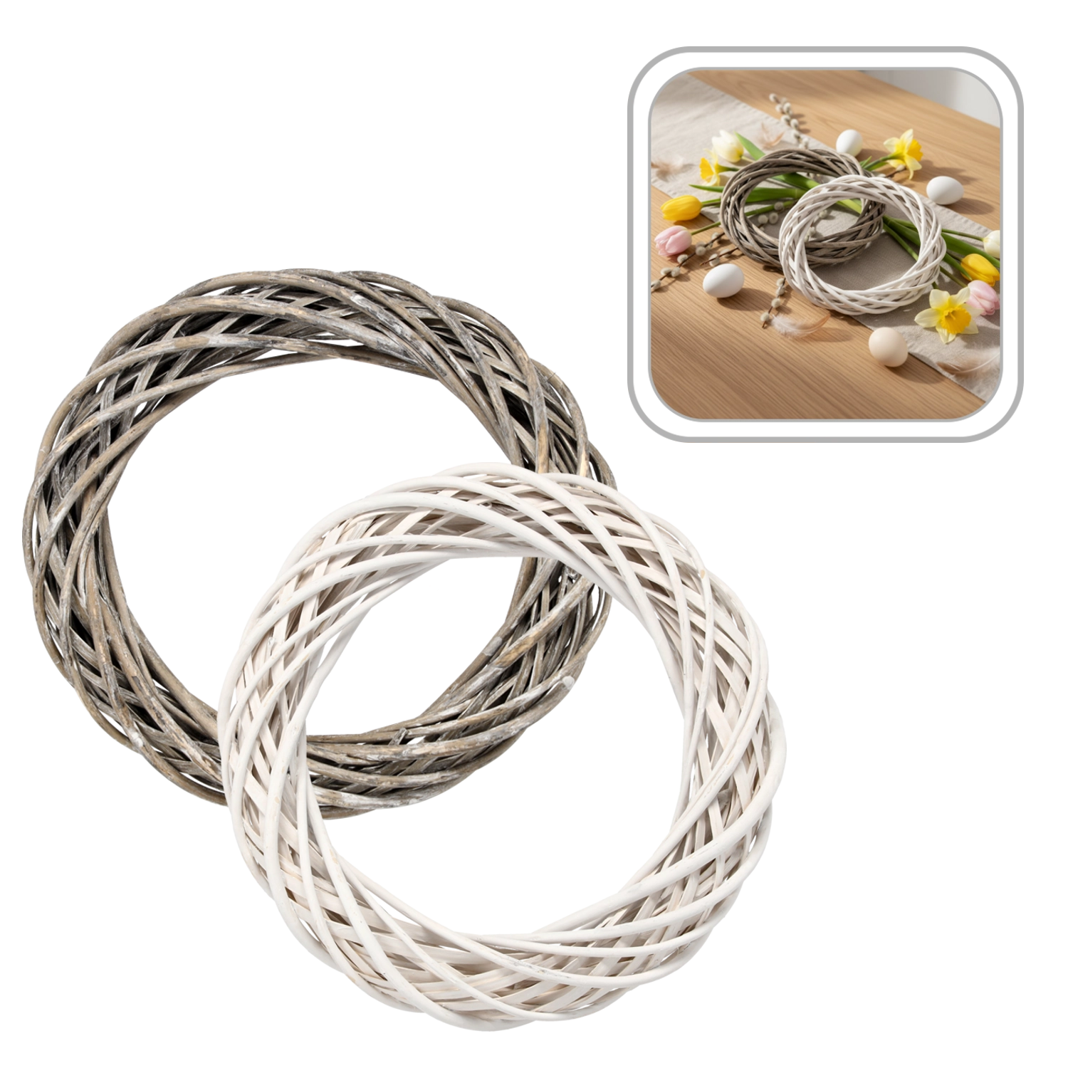 Stilski pleteni venec s premerom 35 cm v beli ali sivi barvi je idealna osnova za dekoracije skozi vse leto. Zaradi naravnega videza in čvrstega pletenja vnese v interier rustikalni čar in brezčasno eleganco. Odlično se poda na vrata, stene, okna ali kot osrednji element na mizi.