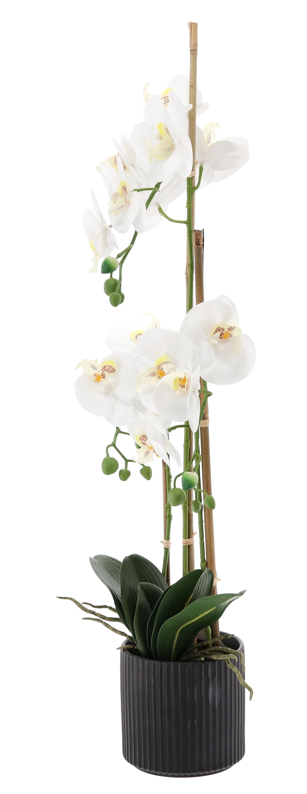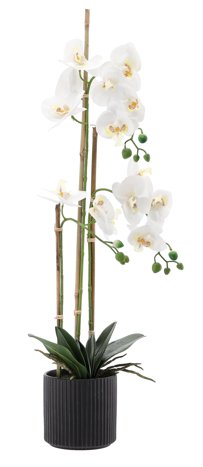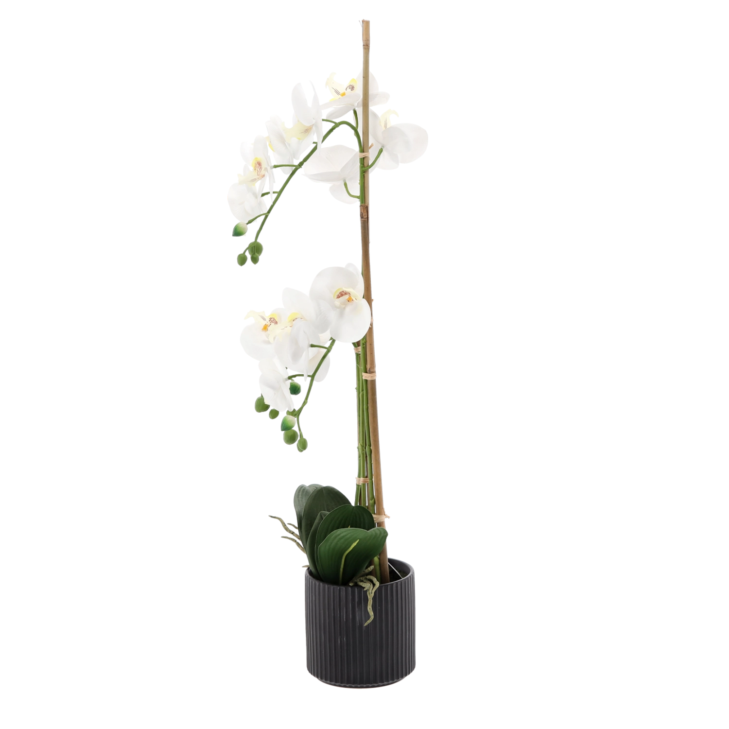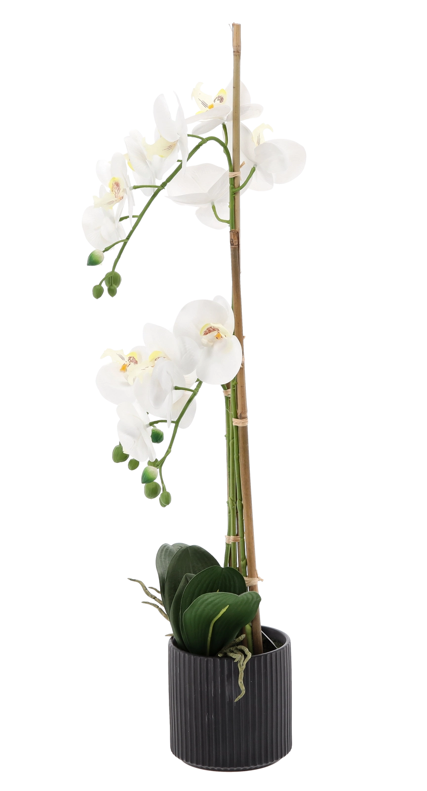 Ta dizajnerska umetna orhideja je visoka 77 cm in je postavljena v diskretnem črnem rebrastem lončku, ki poudari njen eleganten videz. Zahvaljujoč zvesti izdelavi cvetov, popkov in sijočih listov prostoru prinaša naravno vzdušje brez potrebe po vzdrževanju.