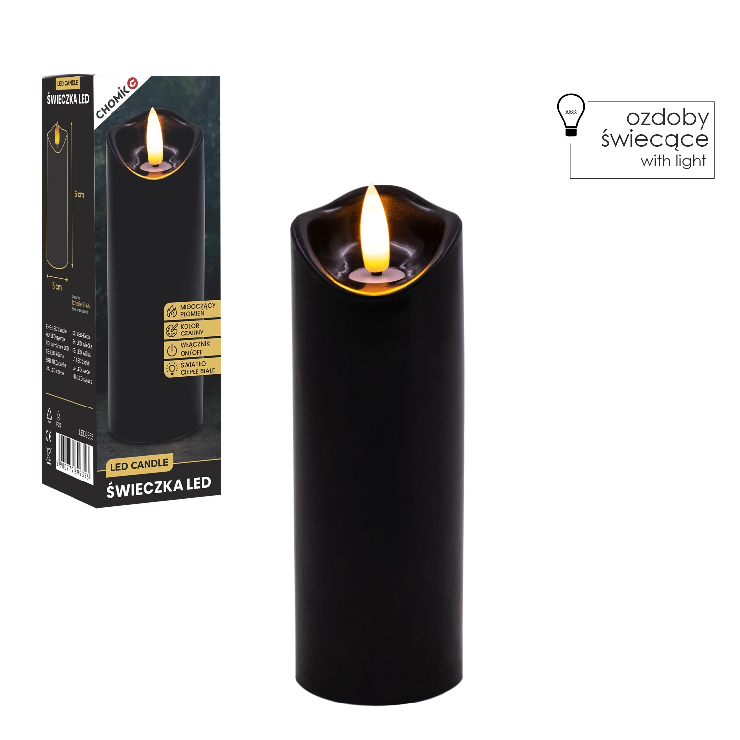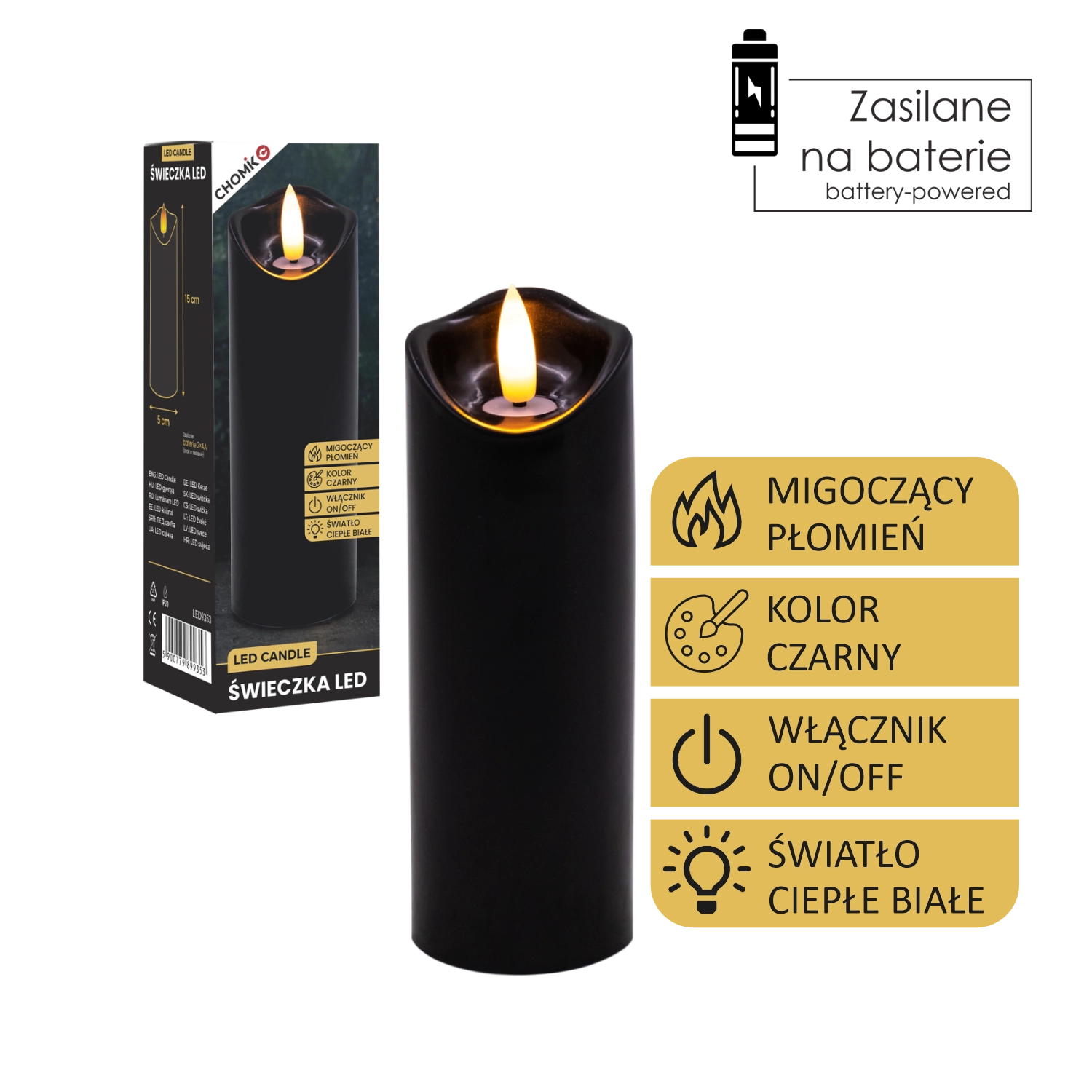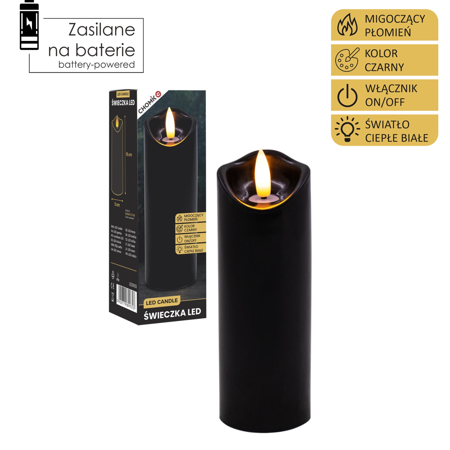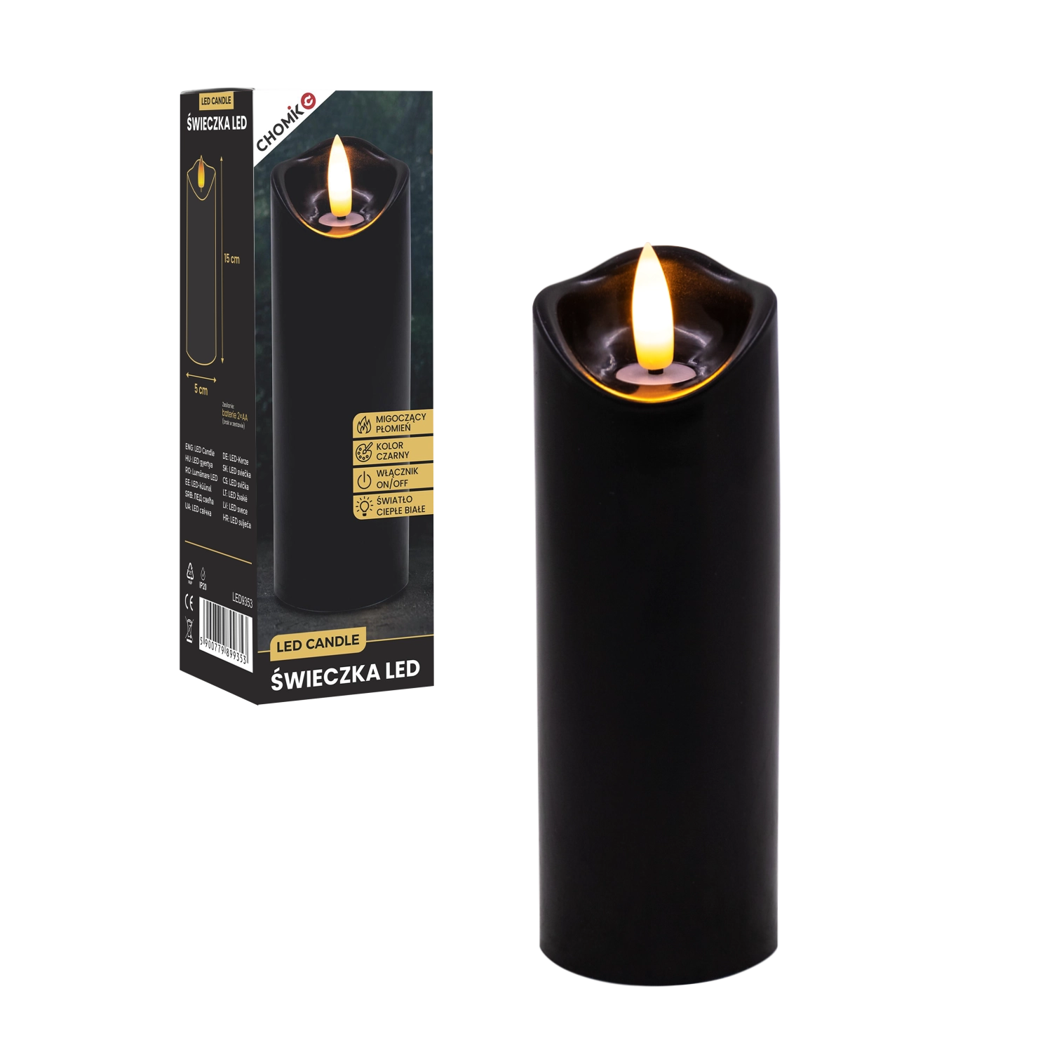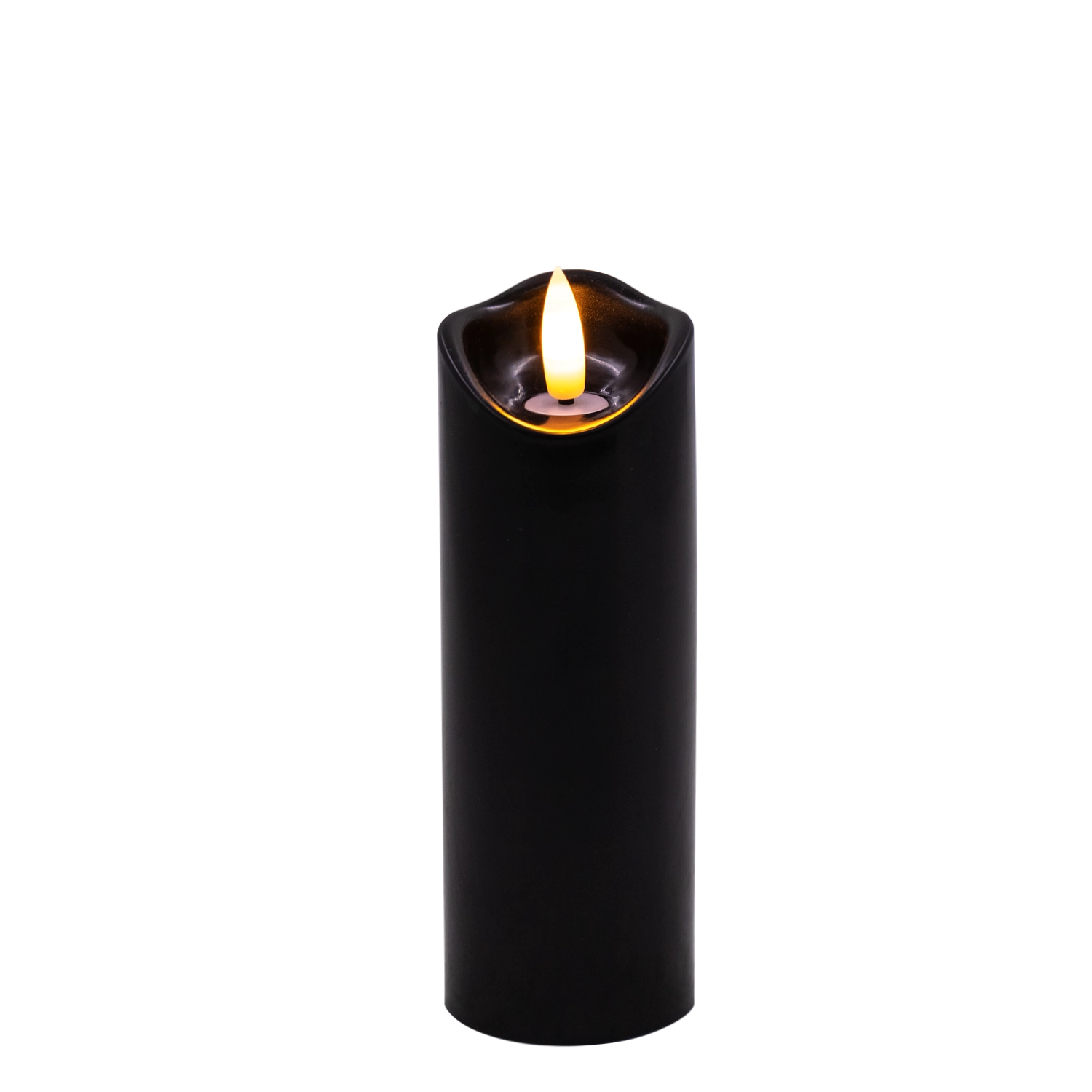 Stilska LED sveča v črni barvi z realističnim, nežno plamenečim toplim belim svetlom. Odlična kot notranja dekoracija ali kot vložena sveča v laterno ali svečnik. Priročno napajanje z 2× AA baterijama (nista priloženi) in enostavno upravljanje On/Off.