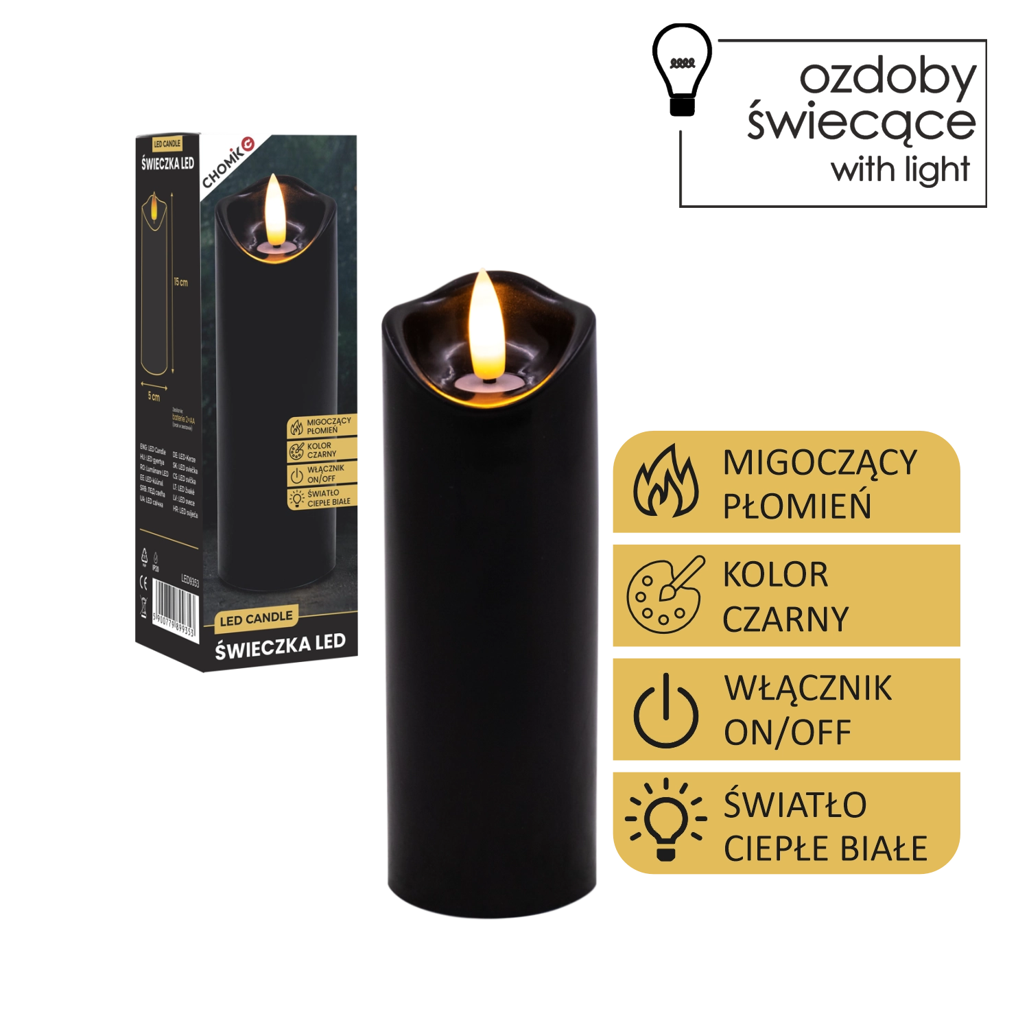 Vašemu domu doda prijetno atmosfero brez dima in nereda. Črno mat ohišje sveče deluje elegantno in se odlično poda v sodobne ter klasične interierje. Toplo belo svetlobo z učinkom plapolanja zvesto posnema pravi plamen.