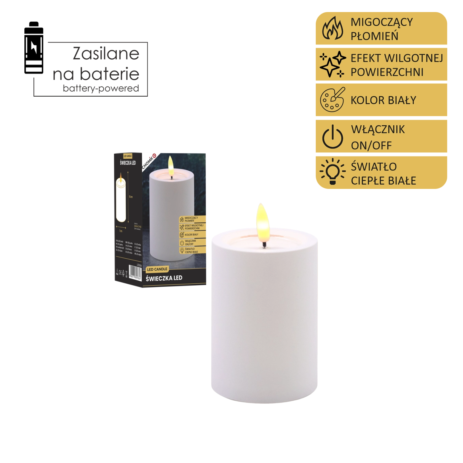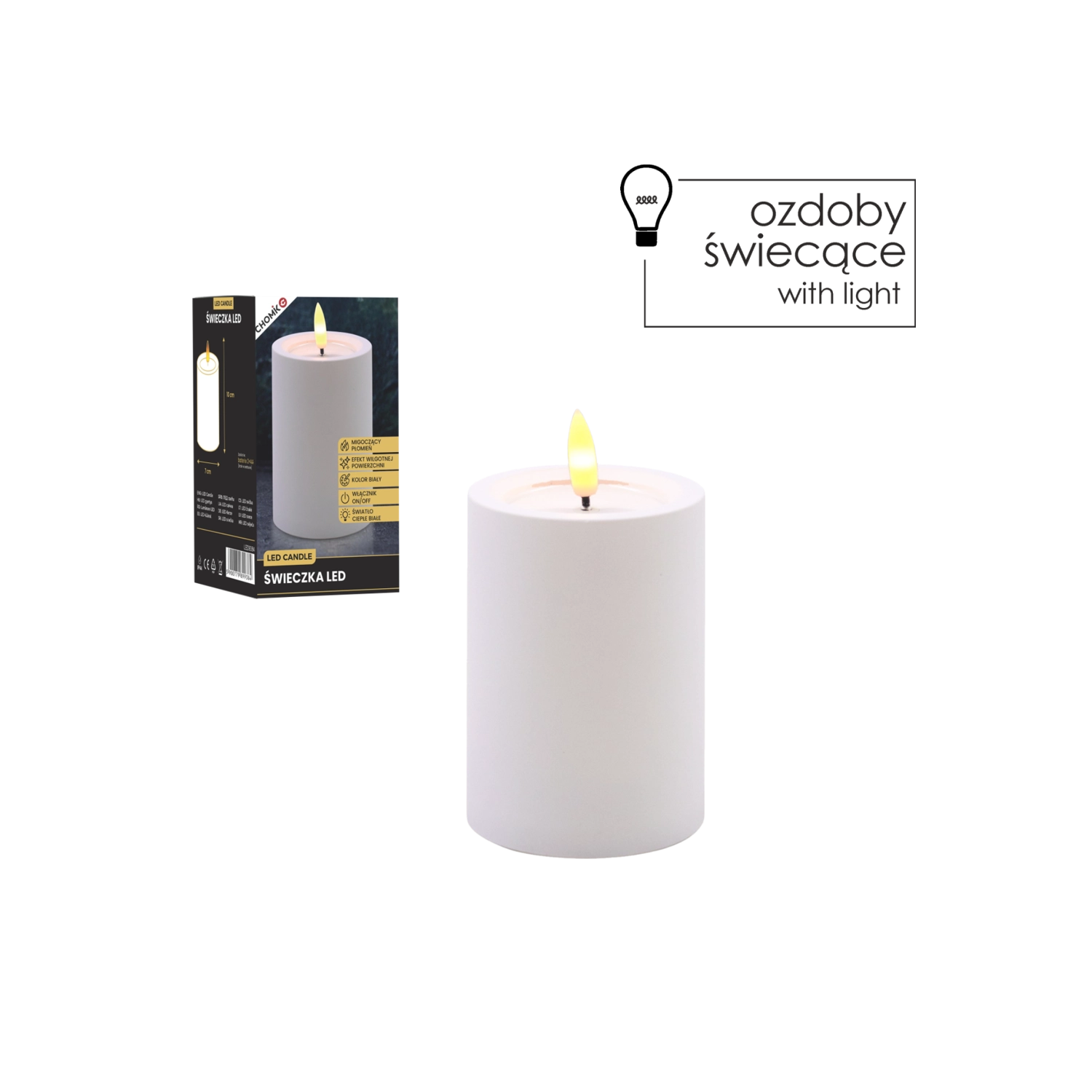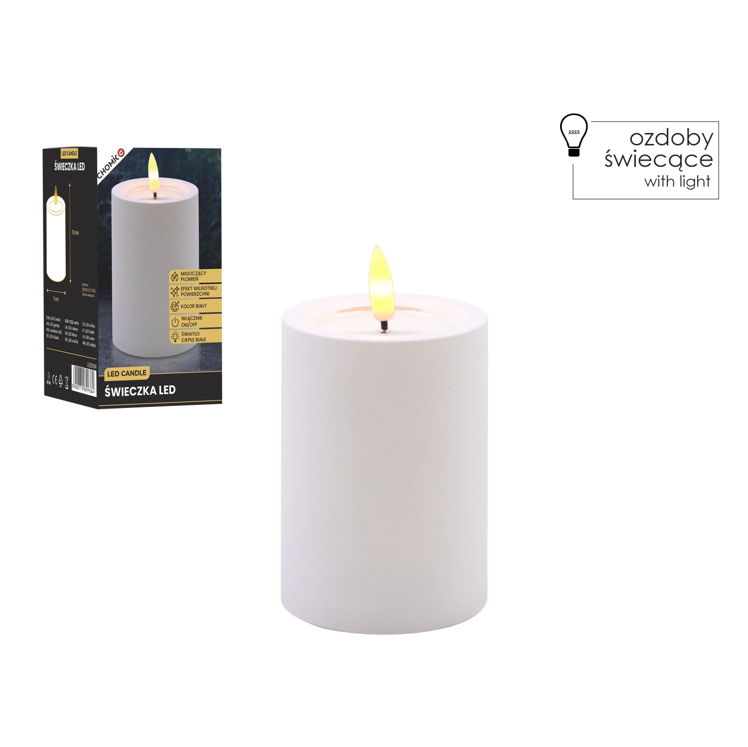 Dekorativna LED sveča v beli barvi z merami 7 × 10 cm prinaša varno in prijetno ambientalno svetlobo z migetajočim plamenom v toplo beli. Ima realističen učinek vlažnega zgornjega roba, odlično se poda v dnevno sobo, spalnico ali na praznično mizo. Brez plamena in dima, enostavno upravljanje s stikalom On/Off, napajanje z 2× AA baterijama (nista priloženi).