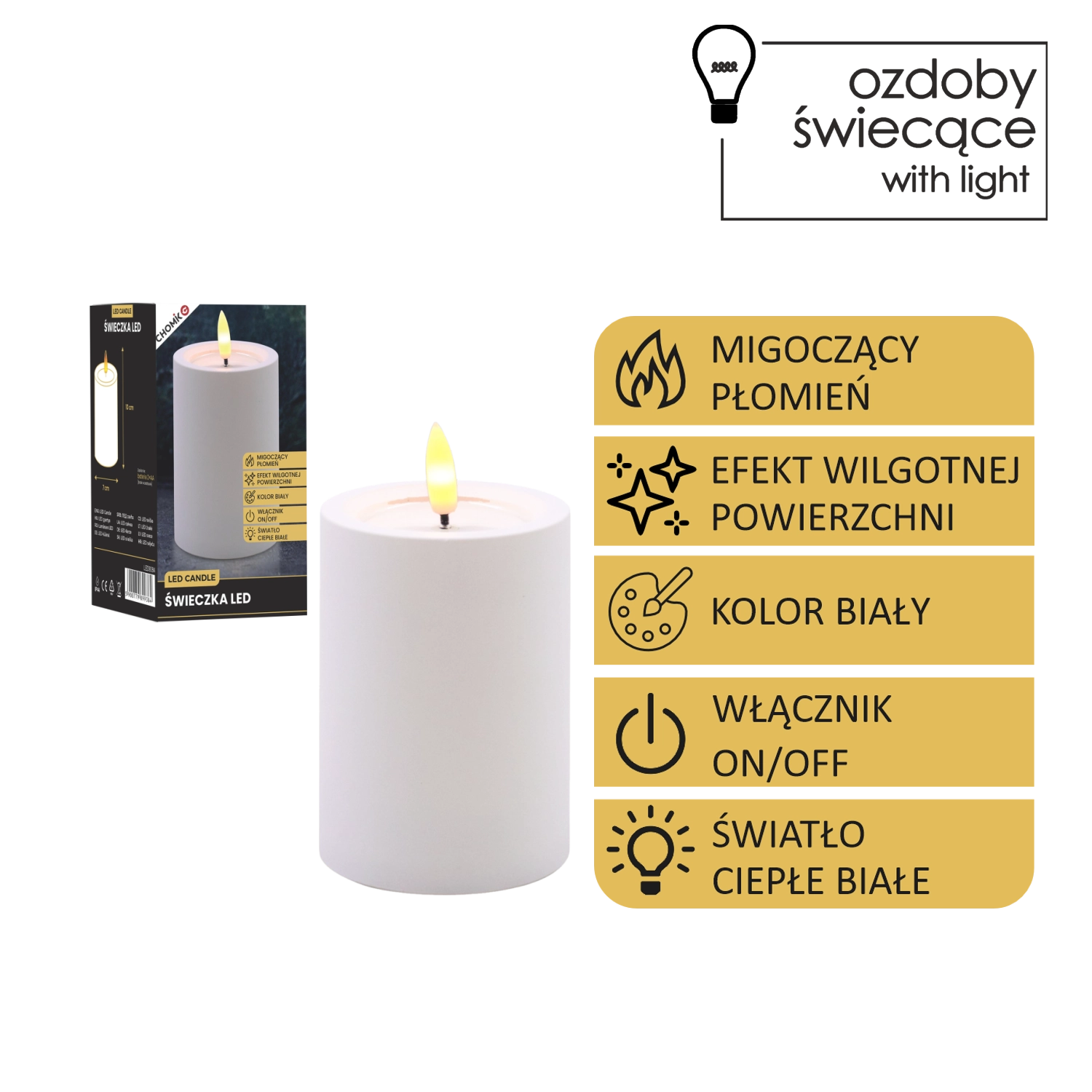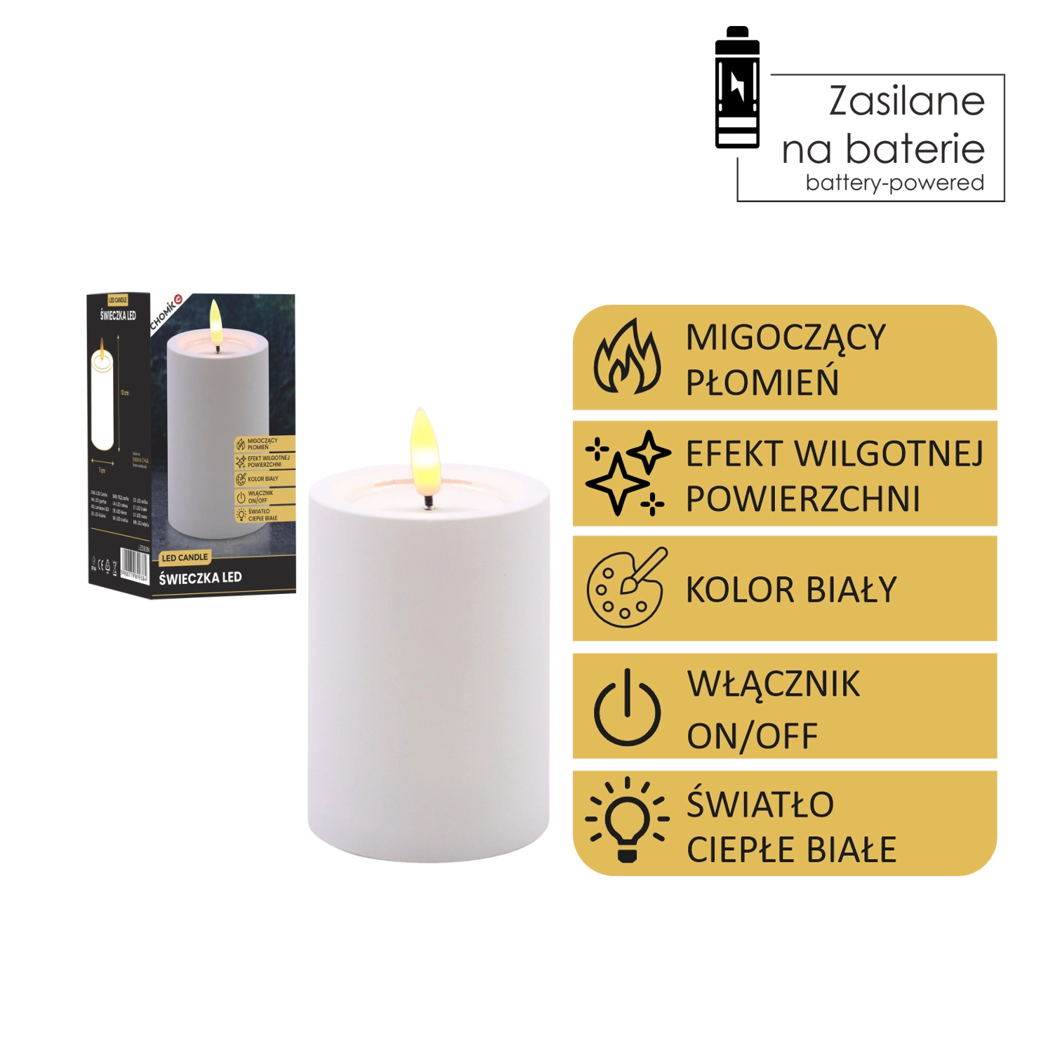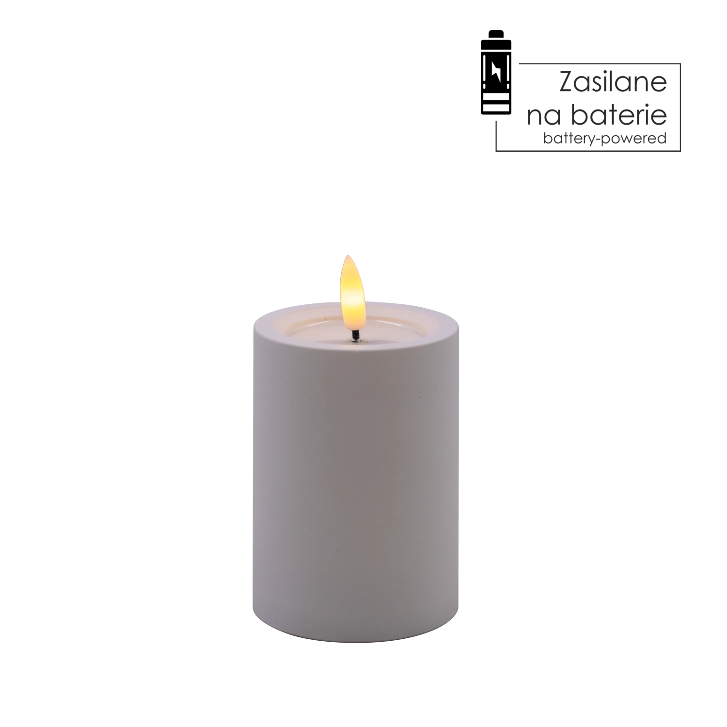 Dekorativna LED sveča v beli barvi z merami 7 × 10 cm prinaša varno in prijetno ambientalno svetlobo z migetajočim plamenom v toplo beli. Ima realističen učinek vlažnega zgornjega roba, odlično se poda v dnevno sobo, spalnico ali na praznično mizo. Brez plamena in dima, enostavno upravljanje s stikalom On/Off, napajanje z 2× AA baterijama (nista priloženi).
